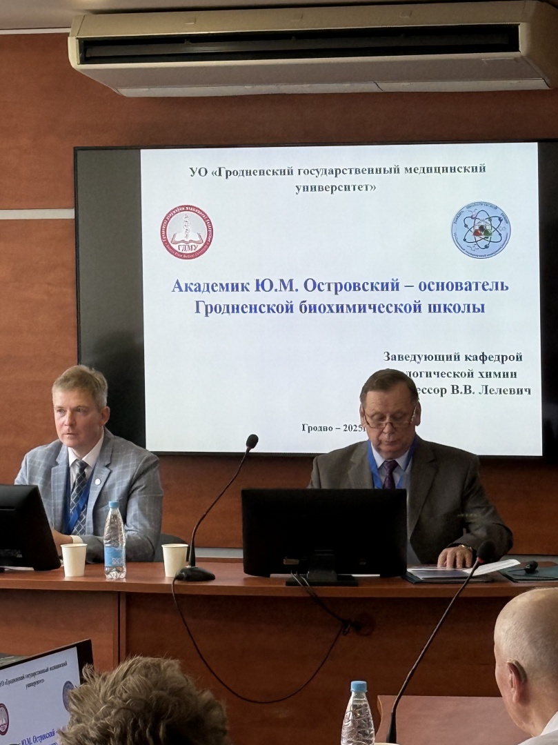 В этот же день кафедрами биологической химии и клинической лабораторной диагностики и иммунологии была проведена республиканская научно-практическая конференция с международным участием «Актуальные проблемы общей и клинической биохимии», посвященная 100-летию со дня рождения академика Ю.М. Островского. В пленарной и двух секционных заседаниях приняли участие специалисты в области фундаментальной и клинической биохимии из Беларуси и Российской Федерации. Отдельной тематикой конференции явились воспоминания последователей и учеников академика Юрия Михайловича Островского о наследии великого земляка - ведущего ученого-биохимика Гродненщины.
