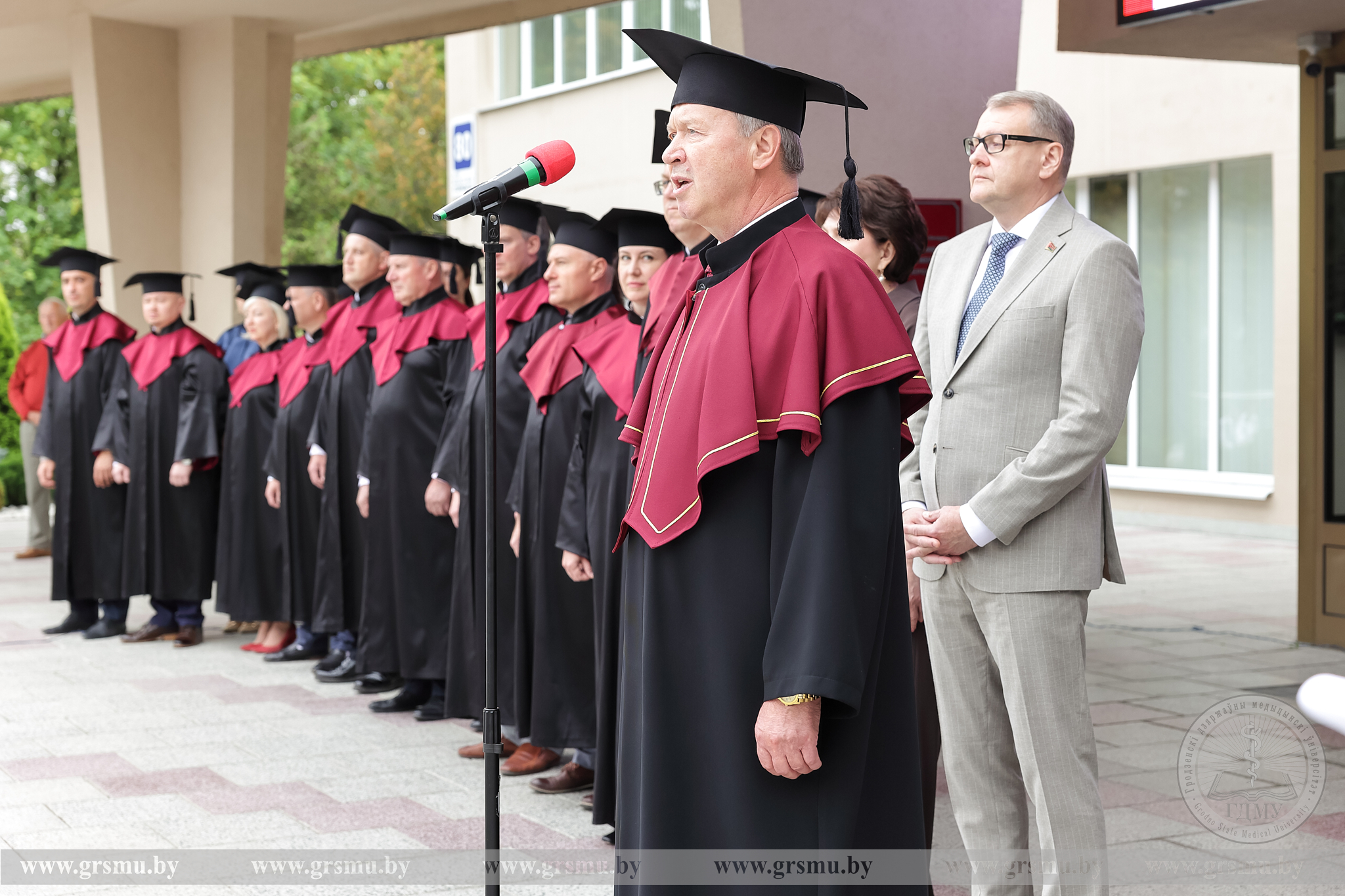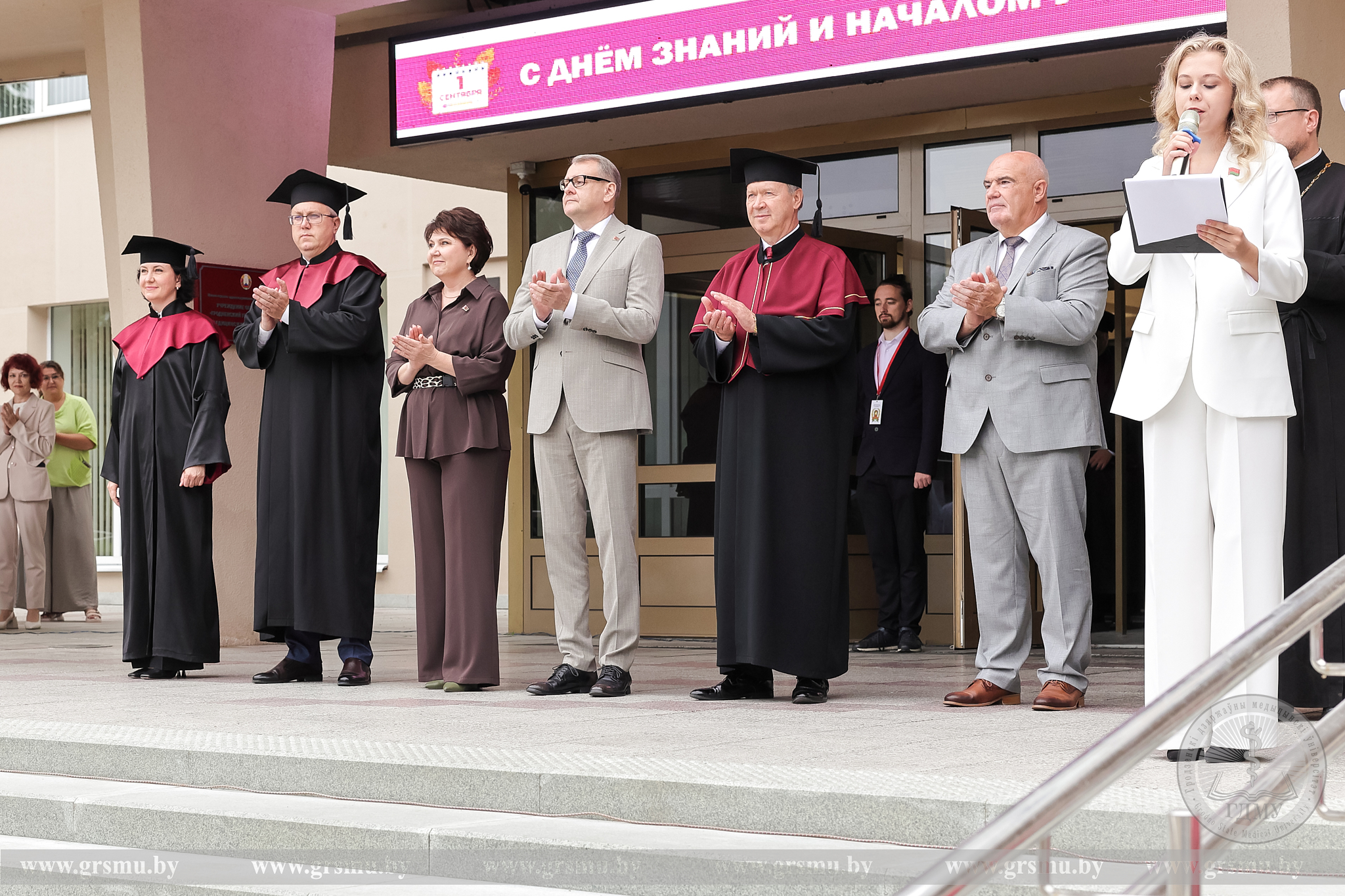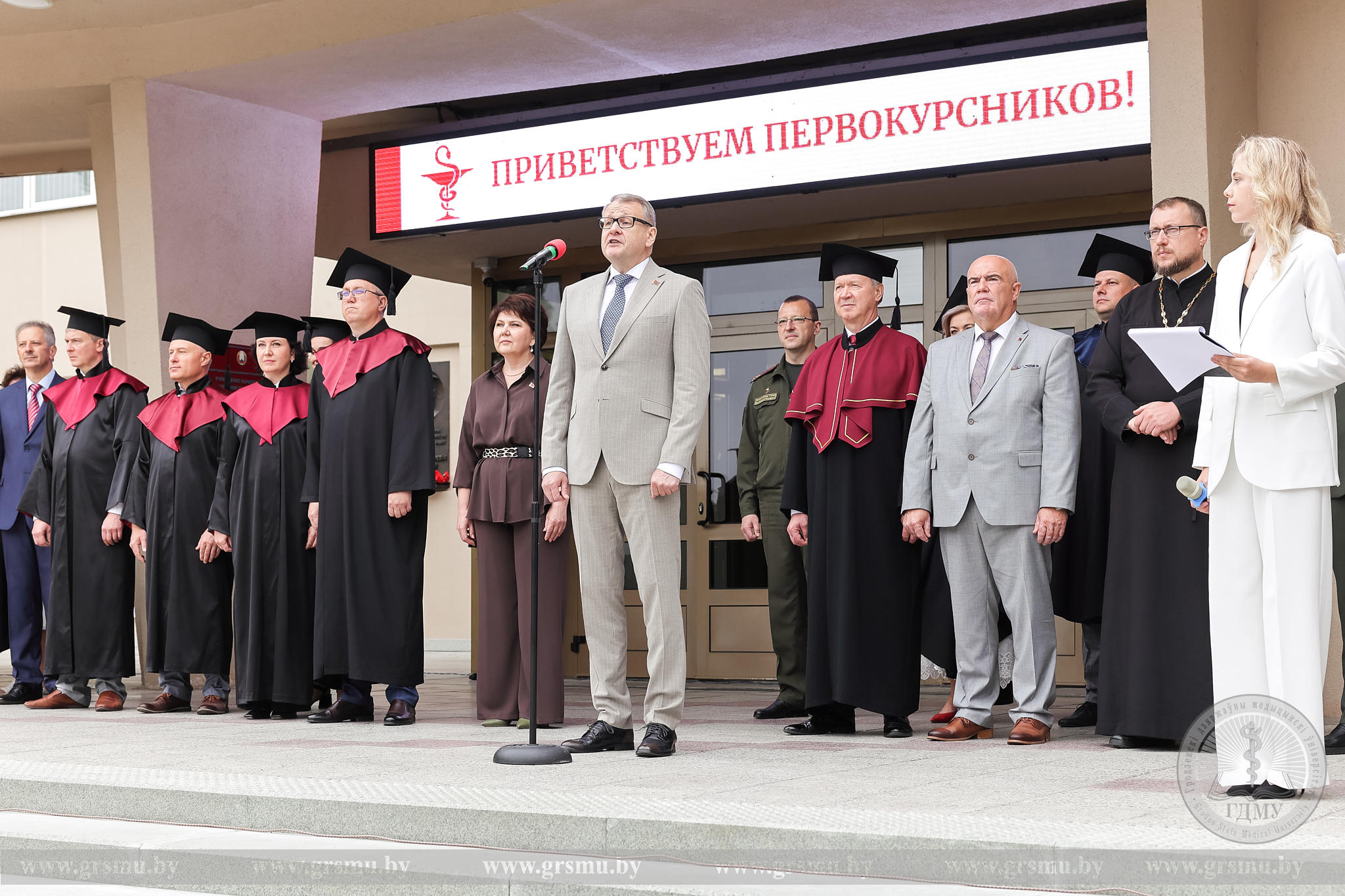- Дарагія нашы першакурснікі! Сёння ў нашай краіне ва ўсіх установах адукацыі праходзяць урачыстыя мерапрыемствы, прысвечаныя Дню ведаў. Гэтае свята аб'ядноўвае ўсіх нас! Першакурснікі, вы ўпершыню пераступіце парог Гродзенскага дзяржаўнага медыцынскага ўніверсітэта. Наша вялікая, дружная, медыцынская сям'я прадстаўлена 5000 студэнтамі, 1500 супрацоўнікамі, выкладчыкамі, якія чакаюць вас з нецярплівасцю! На працягу шасці гадоў вас чакае цяжкае, напружанае, вучоба. Будзе часам складана, але побач з вамі будуць вопытныя выкладчыкі, старшакурснікі, настаўнікі, выхавальнікі, якія прыйдуць на дапамогу ў любую хвіліну, - адзначыў рэктар.