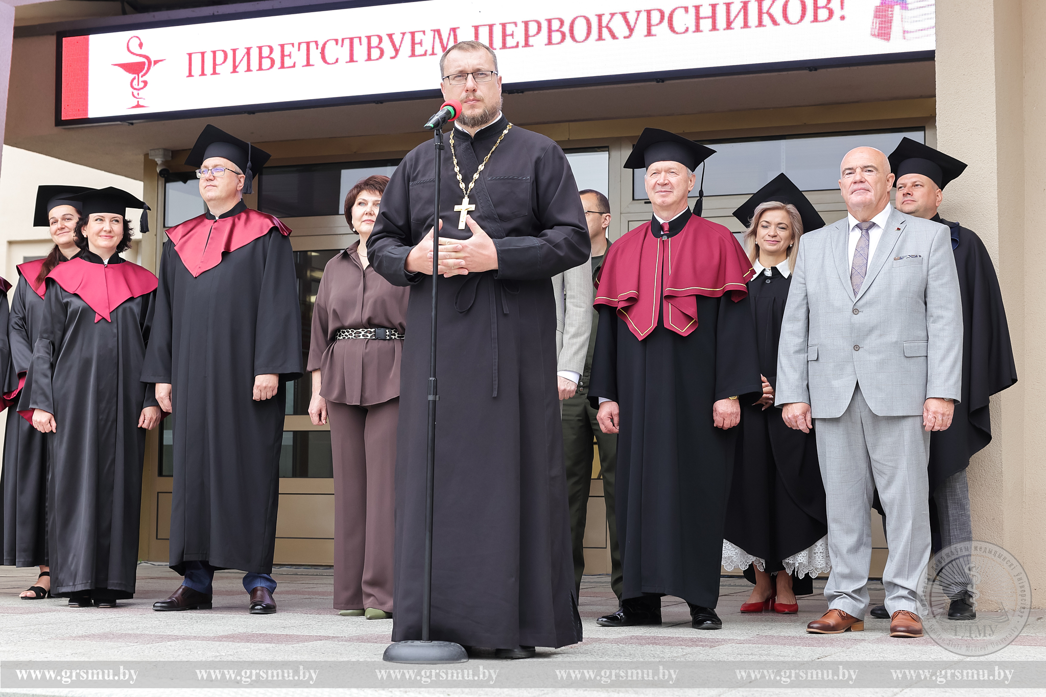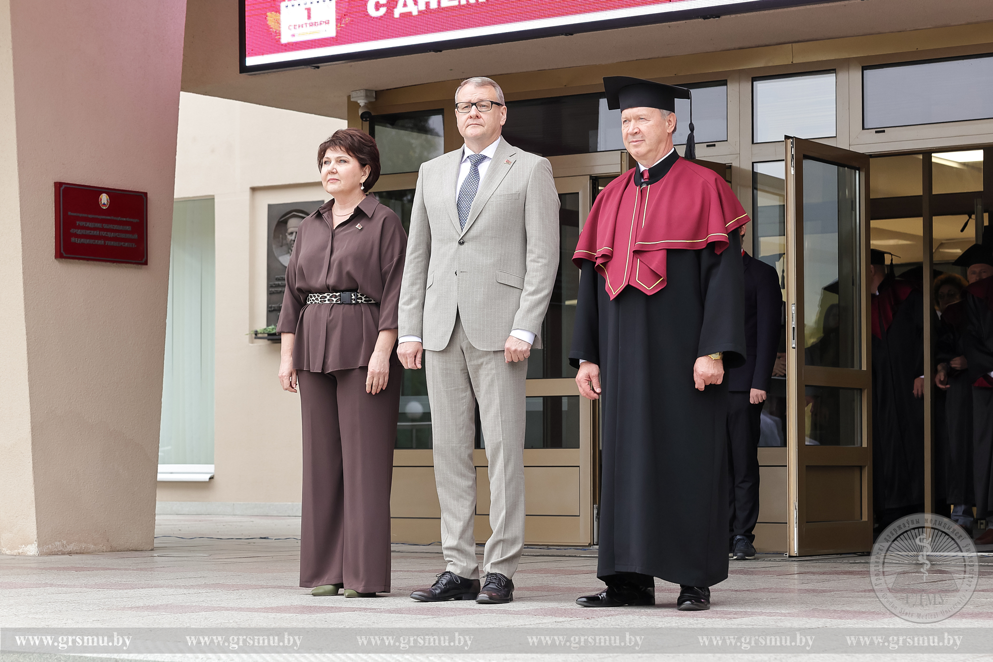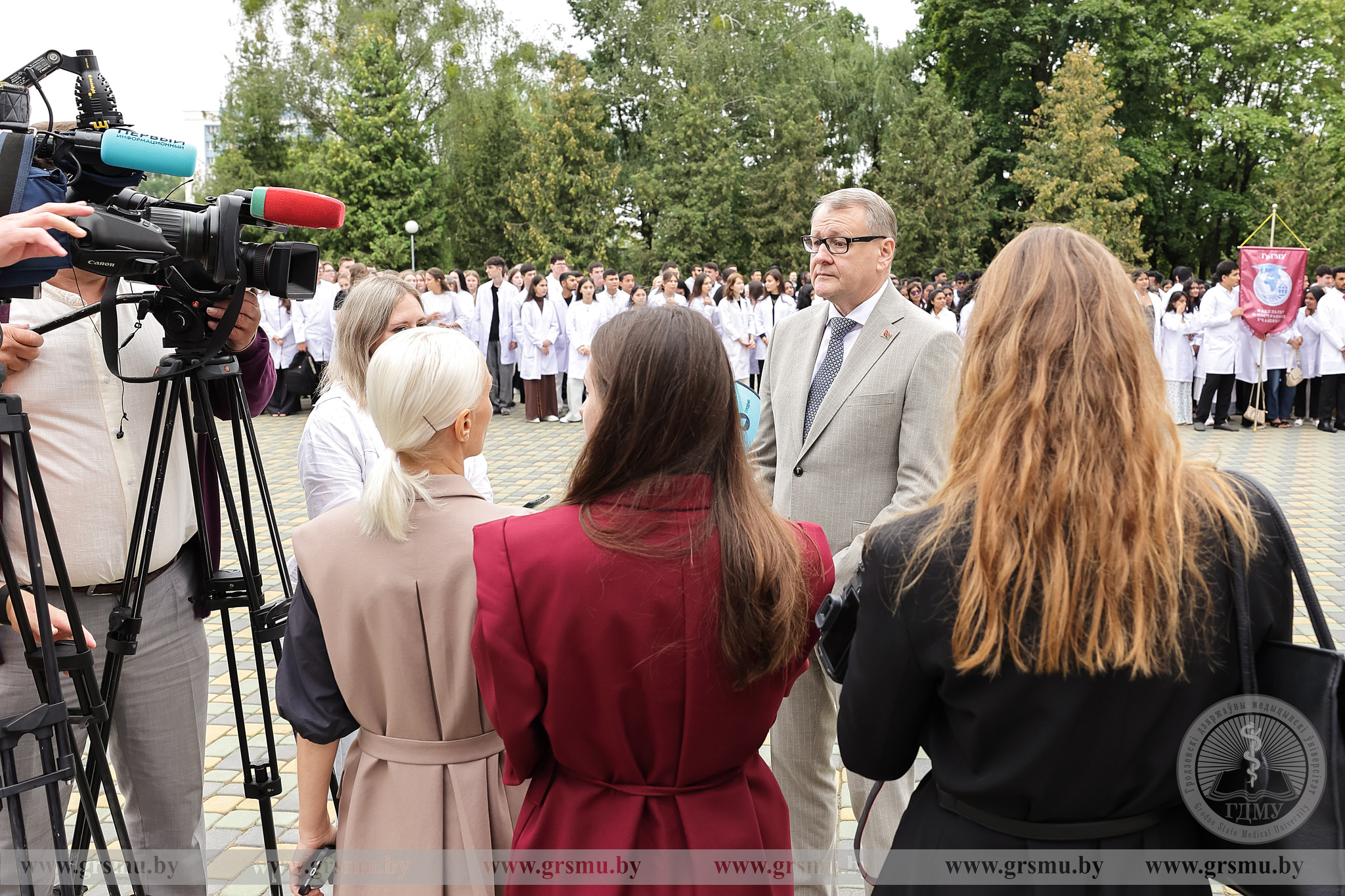 - Дарагія нашы першакурснікі! Сёння ў нашай краіне ва ўсіх установах адукацыі праходзяць урачыстыя мерапрыемствы, прысвечаныя Дню ведаў. Гэтае свята аб'ядноўвае ўсіх нас! Першакурснікі, вы ўпершыню пераступіце парог Гродзенскага дзяржаўнага медыцынскага ўніверсітэта. Наша вялікая, дружная, медыцынская сям'я прадстаўлена 5000 студэнтамі, 1500 супрацоўнікамі, выкладчыкамі, якія чакаюць вас з нецярплівасцю! На працягу шасці гадоў вас чакае цяжкае, напружанае, вучоба. Будзе часам складана, але побач з вамі будуць вопытныя выкладчыкі, старшакурснікі, настаўнікі, выхавальнікі, якія прыйдуць на дапамогу ў любую хвіліну, - адзначыў рэктар.