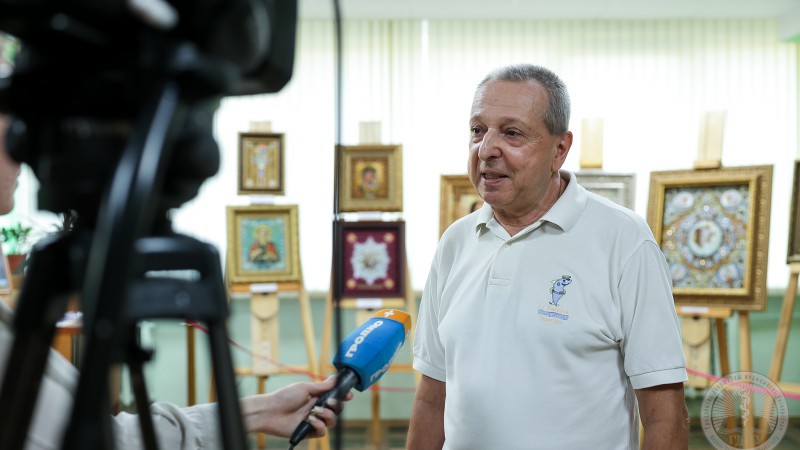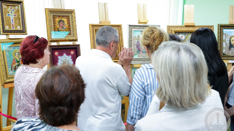 – На гэтым тыдні ў Гродзенскім дзяржаўным медыцынскім універсітэце праходзяць вельмі важныя ўрачыстасці, прысвечаныя 65-годдзю ВНУ! Сёння адкрываецца мая выстава “Одейся светом, яко різою”, – распавёў аўтар выставы Уладзімір Уладзіміравіч Клімовіч. - Першая мая праца-гэта імянная свая ікона, потым вышыў абраз маме, пляменніцы, сыну, і мяне гэта захапіла. Паступова стаў знаходзіць храмавыя іконы, якія мне цікава адшываць. Апошні абраз, які прадстаўлены тут на выставе, – Андрэя Рублёва» Спас Уседзяржыцель " – дакладная лічбавая копія з Траццякоўскай галерэі. Гэтую працу я зрабіў за 2 тыдня, але працаваў па 10 гадзін у дзень.