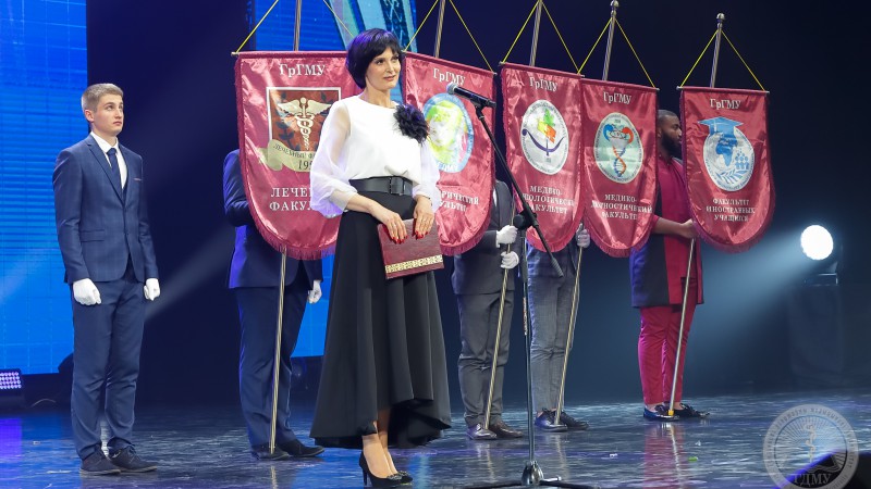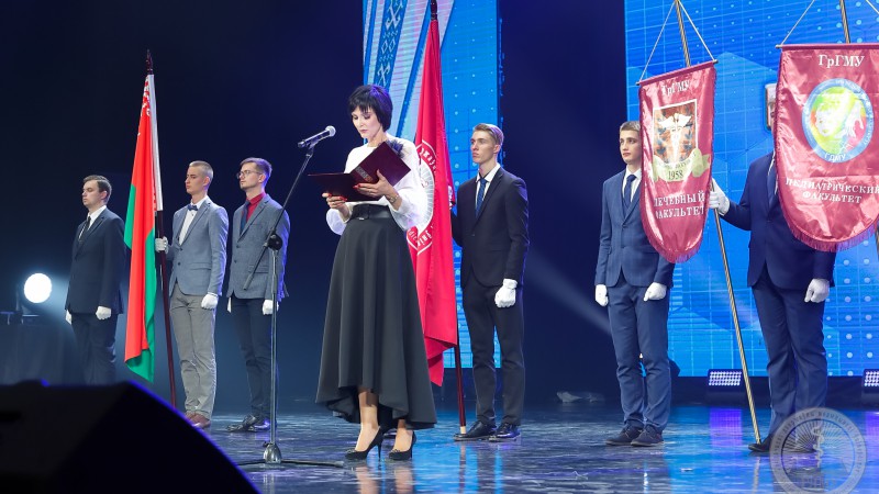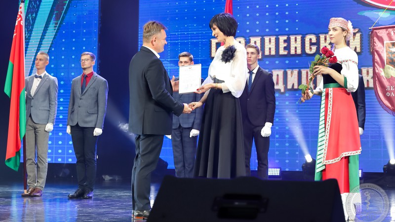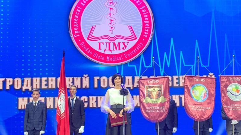 - Паважаны Ігар Георгіевіч, паважаныя ветэраны, выкладчыкі, калегі, студэнты, госці, выпускнікі і ўсе прысутныя! Я хачу сказаць, што Гродзенскі дзяржаўны медыцынскі ўніверсітэт, родны ўніверсітэт-гэта лепшая ВНУ! Тут працуюць творчыя, прафесійныя, самыя лепшыя выкладчыкі. Тут вучацца актыўныя, пазітыўныя, сапраўдная будучыня нашай медыцыны-студэнты! З юбілеем, са святам! Жадаю вам росквіту, новых дасягненняў, дабрабыту, здароўя ўсім! - сказала Алена Мікалаеўна.