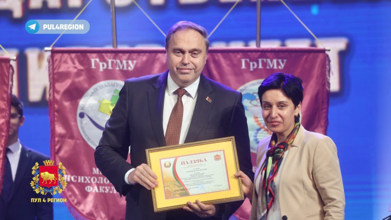 Старшыня Гродзенскага абласнога выканаўчага камітэта Уладзімір Сцяпанавіч Каранік зачытаў прывітальны адрас старшыні Савета Рэспублікі Нацыянальнага сходу Рэспублікі Беларусь Наталлі Іванаўны Качанавай з нагоды 65-гадовага юбілею Гродзенскага дзяржаўнага медыцынскага ўніверсітэта.