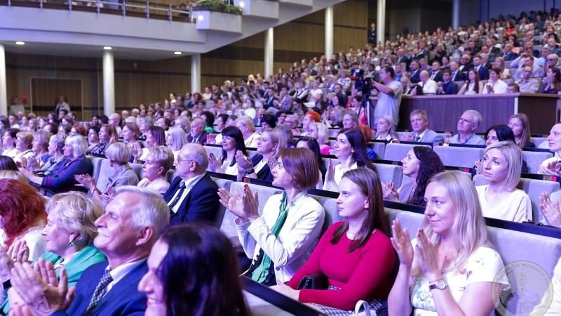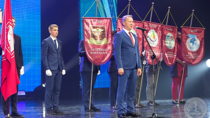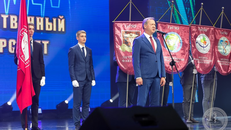 - І вось нам ужо 65 гадоў! Гэта ўжо ВНУ з багатай гісторыяй, традыцыямі, дасягненнямі, узнагародамі. Мы падрыхтавалі амаль 30000 выпускнікоў, ганарымся дасягненнямі нашых студэнтаў, навукова-педагагічных школ. За ўсім гэтым, безумоўна, стаіць вялікая, напружаная і зладжаная праца многіх пакаленняў выкладчыкаў, супрацоўнікаў і студэнтаў Гродзенскага медыцынскага ўніверсітэта, – сказаў рэктар. - Мы з аптымізмам глядзім у будучыню, бо нам яшчэ толькі 65 гадоў. Для ўніверсітэта-гэта маладосць, рух наперад! І сёння ГрДМУ-гэта вялікая, дружная, згуртаваная сям'я. У нас агульная мэта-мы робім усё для таго, каб наша ВНУ развівалася, імкнёмся да новых вяршынь і перамог! Дарагія сябры, я шчыра хачу павіншаваць усіх нас з гэтым выдатным юбілеем, пажадаць усім здароўя, мірнага неба, творчых, навуковых поспехаў. Нашым студэнтам-праслаўляць сваю Alma Mater! Выказваю словы падзякі і нашаму Прэзідэнту Рэспублікі Беларусь Аляксандру Рыгоравічу Лукашэнку за тую ўвагу, якую ён аказвае сістэме вышэйшай медыцынскай адукацыі. Дзякую таксама і Міністэрства аховы здароўя, і, вядома ж, мясцовыя органы ўлады ў асобе Уладзіміра Сцяпанава Караніка за ўвагу, падтрымку і шчыльнае ўзаемадзеянне з нашым універсітэтам. Са святам, дарагія сябры!