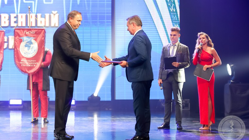 - Гродзенскі дзяржаўны медыцынскі ўніверсітэт мае сваю асаблівую атмасферу. У гэты святочны дзень я хачу пажадаць, каб універсітэт і далей рухаўся наперад, развіваў свае планы, бо 65 гадоў для ВНУ – гэта толькі пачатак, а ў нашай ВНУ стартавыя магчымасці лепшыя! Ветэранам ГрДМУ, у першую чаргу, хачу пажадаць здароўя, і працягваць далей, з пакалення ў пакалення, перадаваць традыцыі, вопыт выдатнага ВНУ. Прафесарска – выкладчыцкаму складу і выпускнікам-новых прафесійных навуковых дасягненняў, здольных студэнтаў, а будучаму нашай медыцыны хачу пажадаць вельмі яркіх уражанняў ад студэнцкіх гадоў, лёгкіх квіткоў, добрых выкладчыкаў, а галоўнае, каб пасля заканчэння ВНУ вы знайшлі сваё месца ў нашай сістэме аховы здароўя! Са святам, дарагія сябры, удачы, усяго самага добрага вам і вашым блізкім! - сказаў Уладзімір Сцяпанавіч.