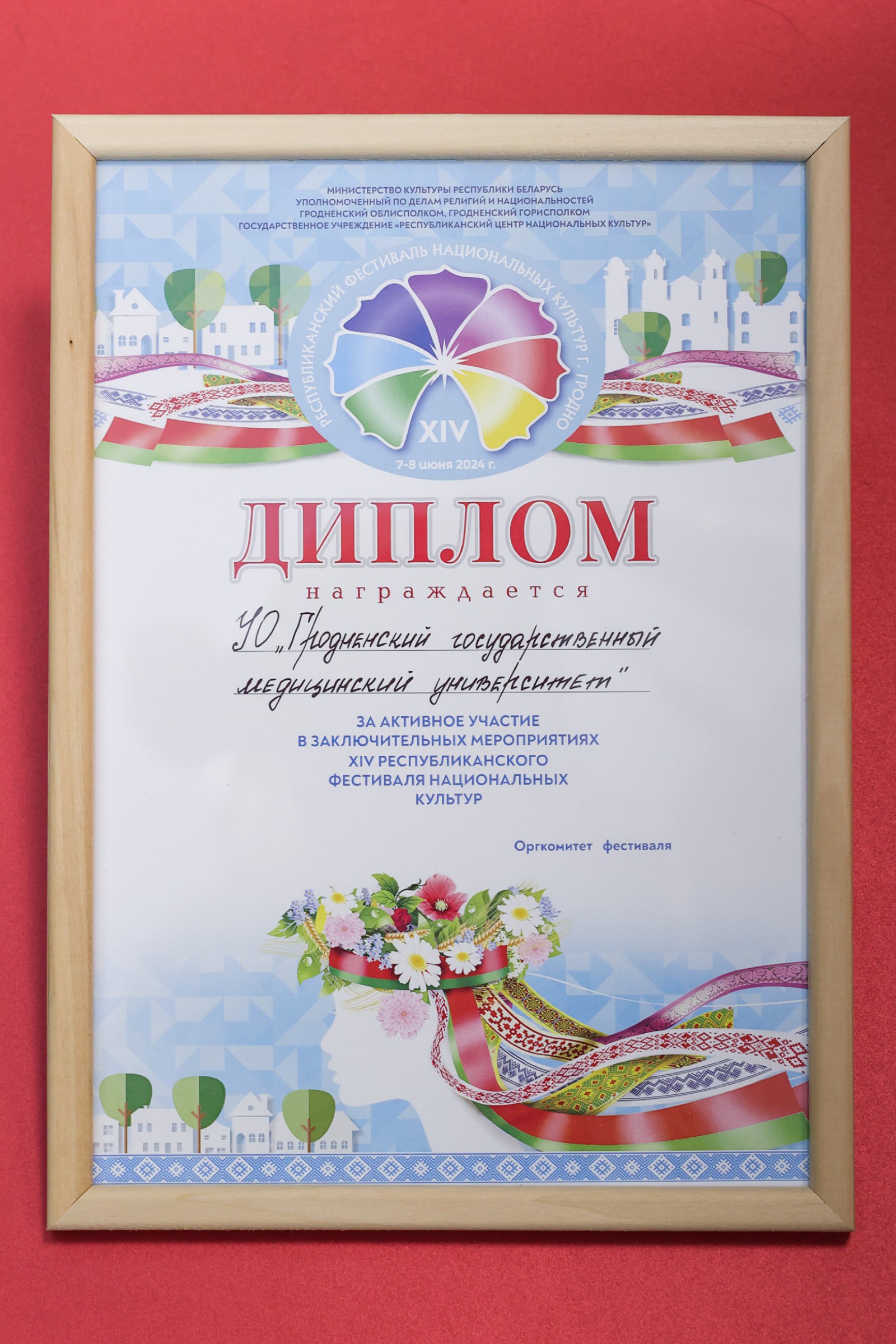 Educational Institution "Grodno State Medical University" received a diploma for active participation in closing events of XIV Republican festival of national cultures.