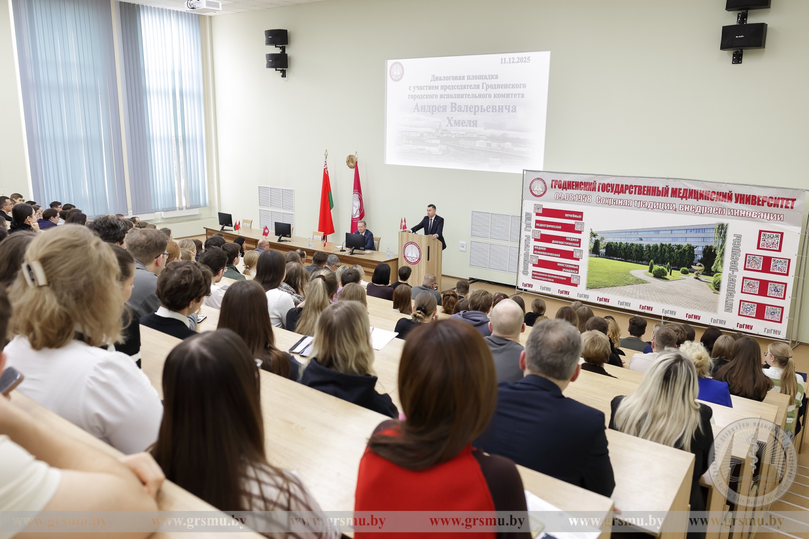 В Гродненском государственном медицинском университете прошла диалоговая площадка с председателем Гродненского городского исполнительного комитета Андреем Валерьевичем Хмелем. В мероприятии участвовали руководство вуза, профессорско‑преподавательский состав, сотрудники и студенты. Спектр обсуждаемых вопросов оказался весьма разнообразным.