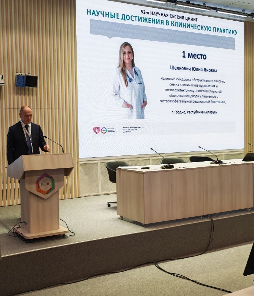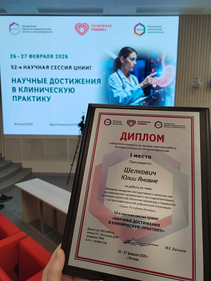 26-27 февраля 2026 г. в Москве, в рамках 52-й научной сессии ЦНИИ гастроэнтерологии «Научные достижения в клиническую практику», состоялась церемония награждения победителей конкурса. Юлия Яновна представила свою работу «Влияние синдрома обструктивного апноэ во сне на клинические проявления и гистоархитектонику эпителия слизистой оболочки пищевода у пациентов с гастроэзофагеальной рефлюксной болезнью».