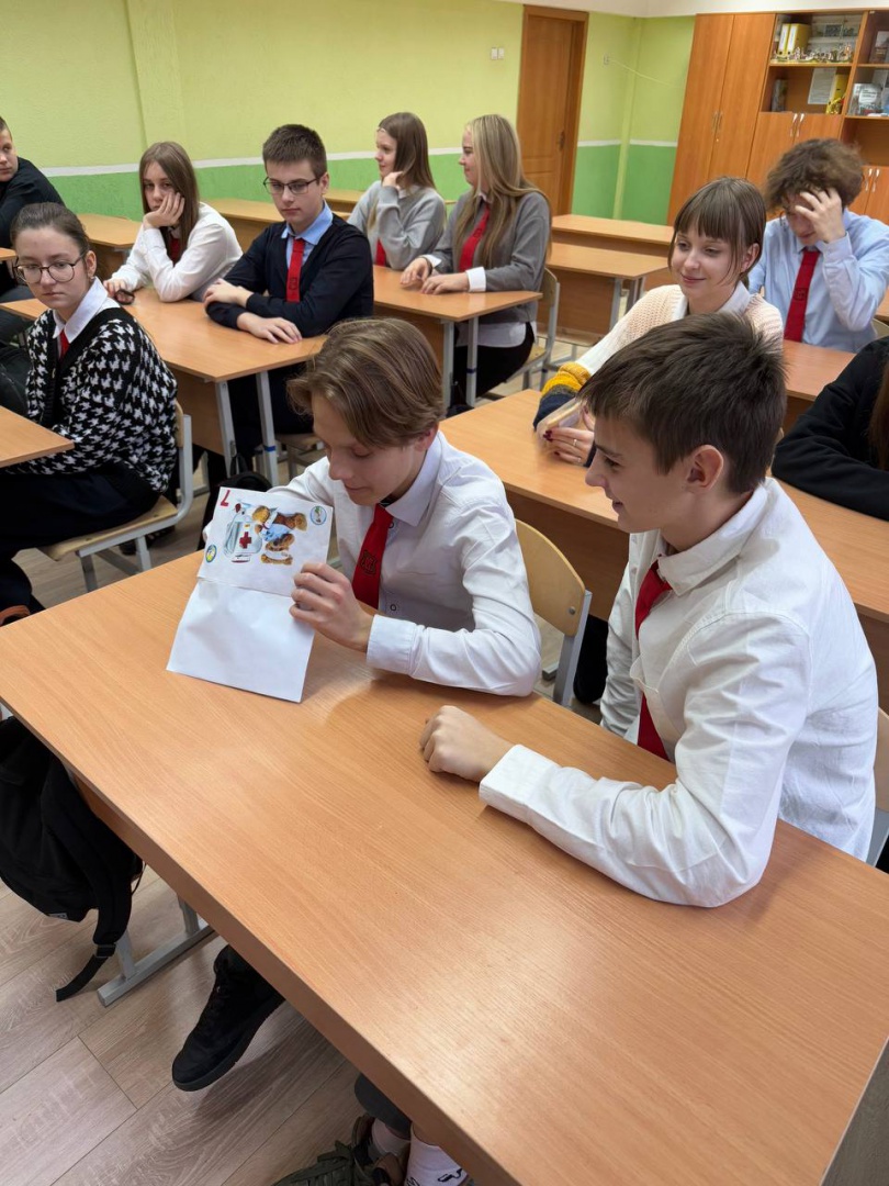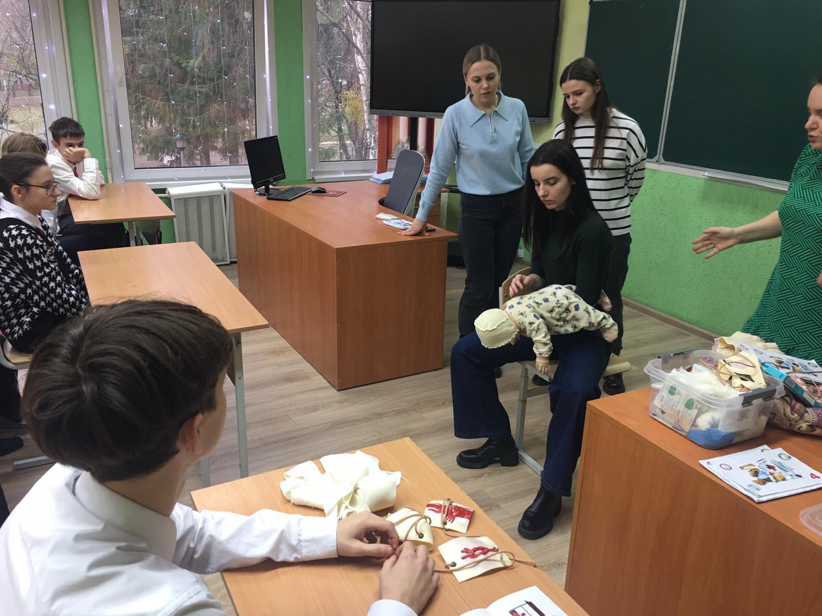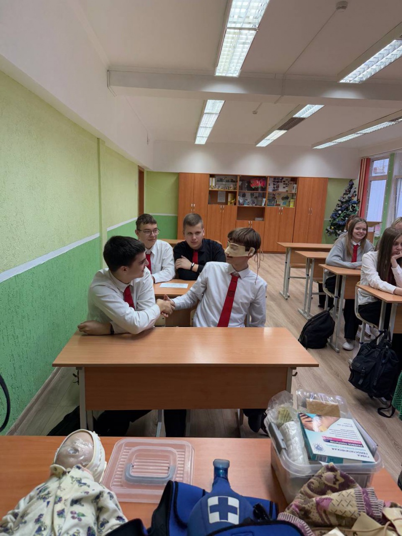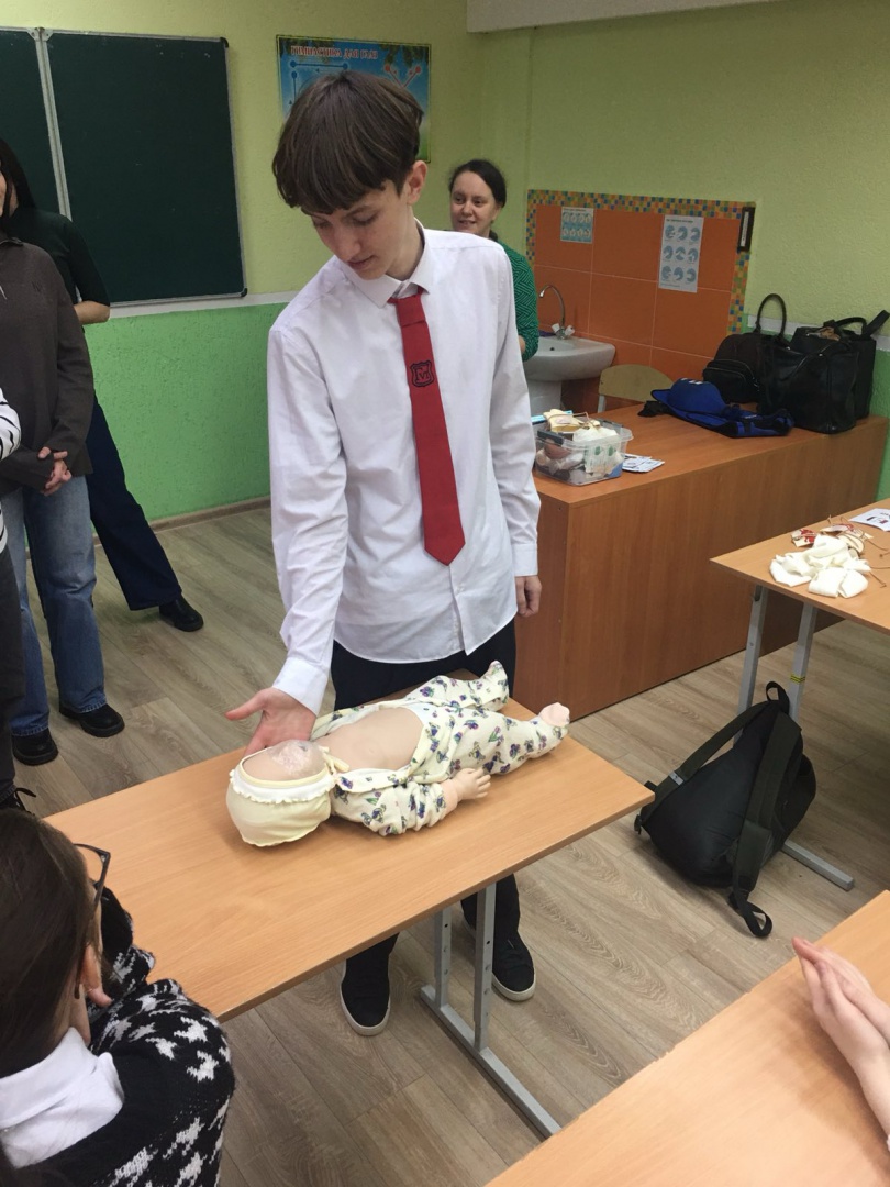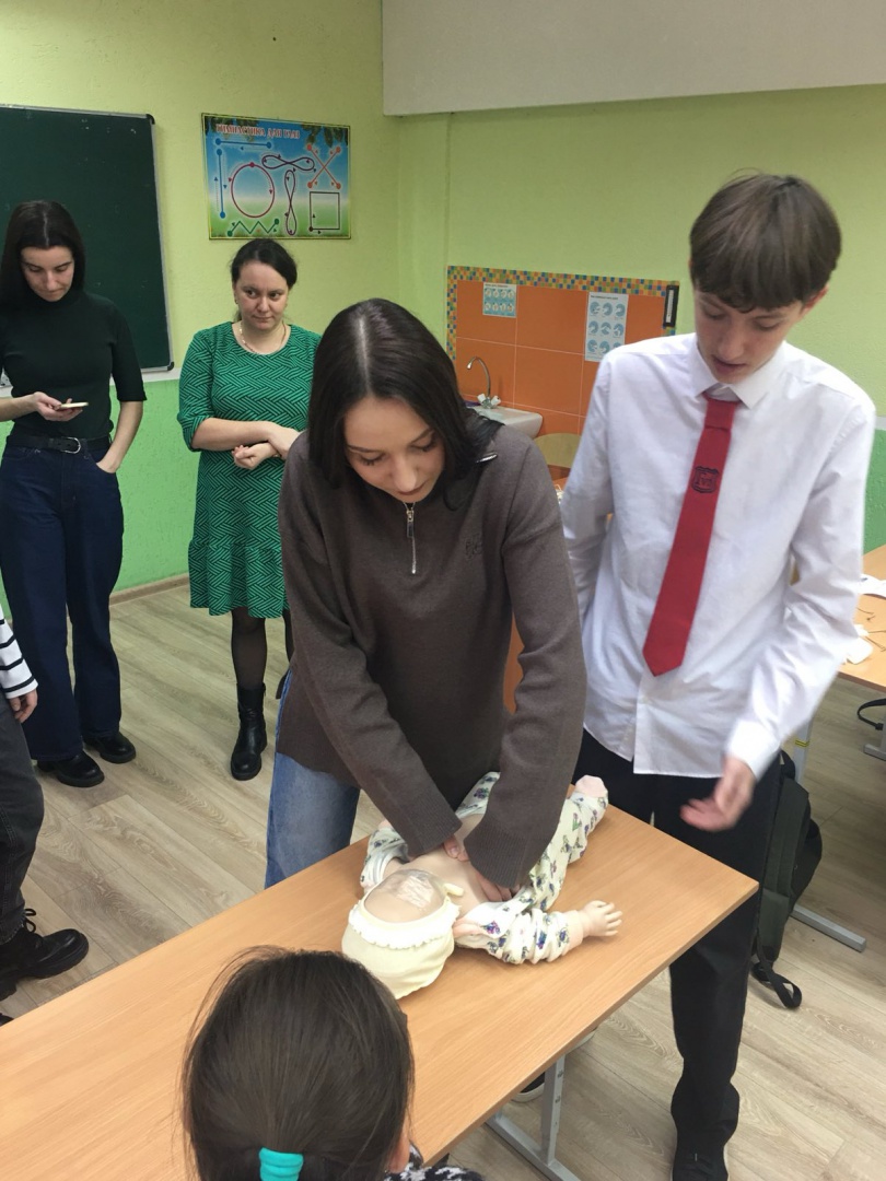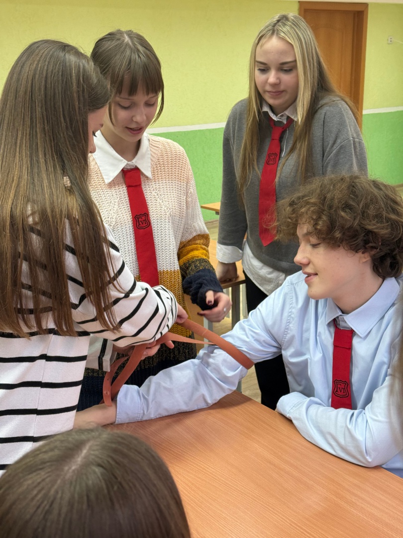 Для учащихся 9‑х классов профиля «Химия‑биология» был организован практический курс по оказанию первой помощи. В игровой форме школьники решали кроссворды и ребусы, а затем отрабатывали навыки на фантомах: учились накладывать кровоостанавливающие жгуты, мобилизирующие шины и давящие повязки, осваивали использование подручных средств для взаимопомощи. Занятия также способствовали развитию командного взаимодействия, коммуникативных навыков и умения принимать решения в экстренных ситуациях.