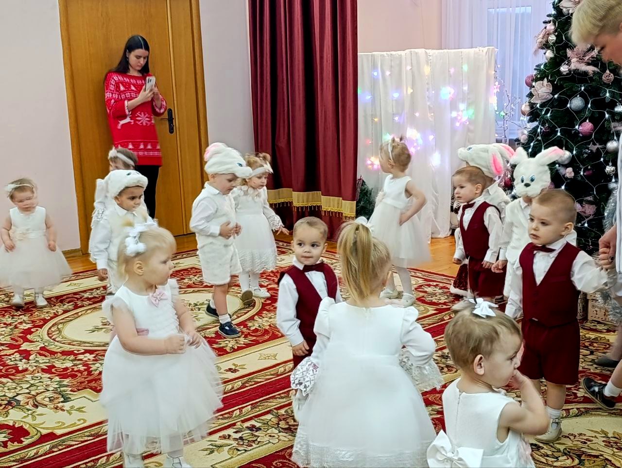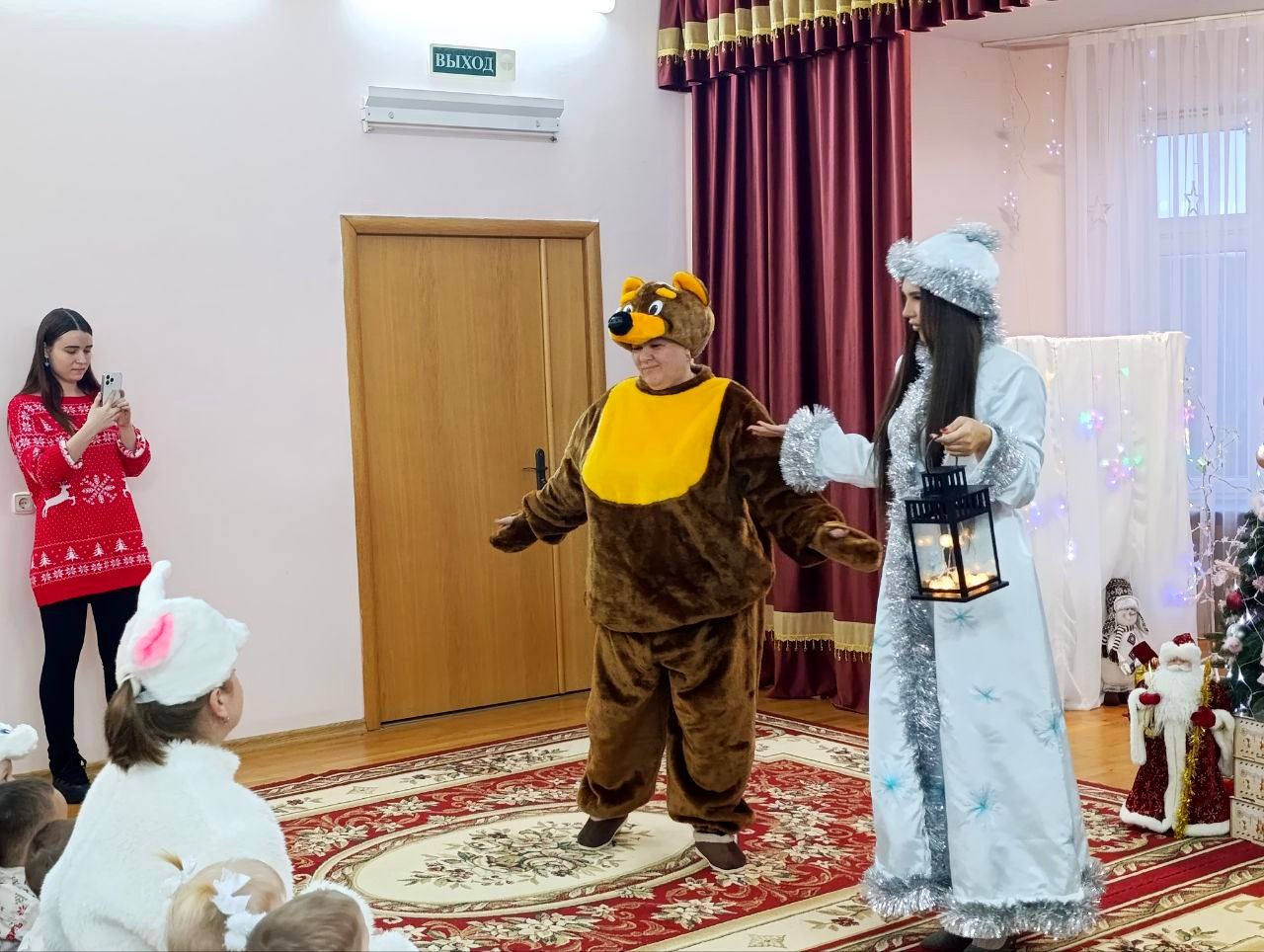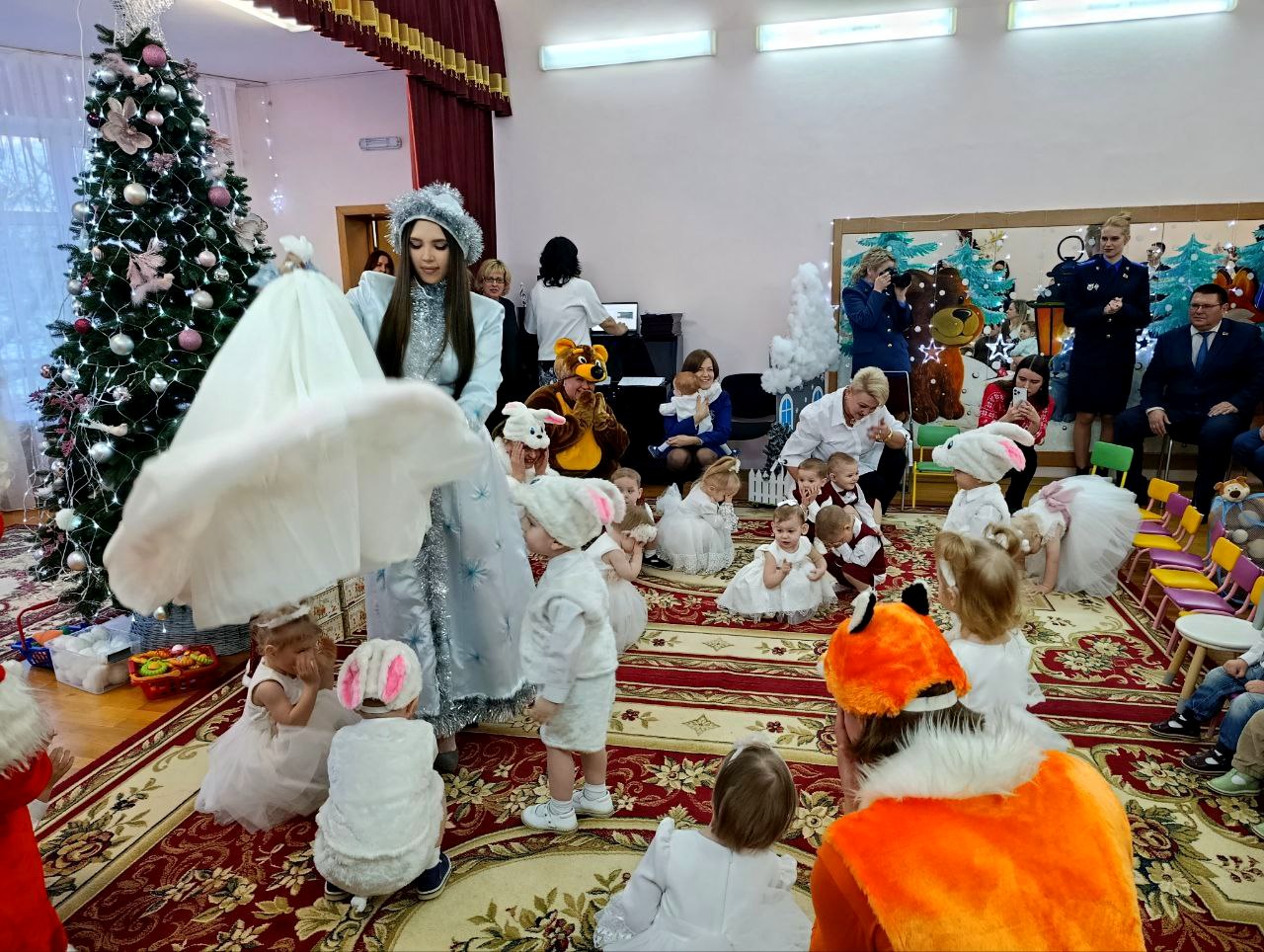 Маленькие воспитанники подготовили для посетителей настоящий праздничный утренник. Вместе со сказочными героями – Лисой, Зайчиком и Медведем – ребята весело поиграли в снежки и от души станцевали. Гости с радостью включились в веселье: водили с малышами хоровод и с нетерпением ждали появления главных волшебников праздника – Деда Мороза и Снегурочки. А дети, в свою очередь, подарили всем присутствующим самое ценное – искренний смех, улыбки и частичку своего тепла.