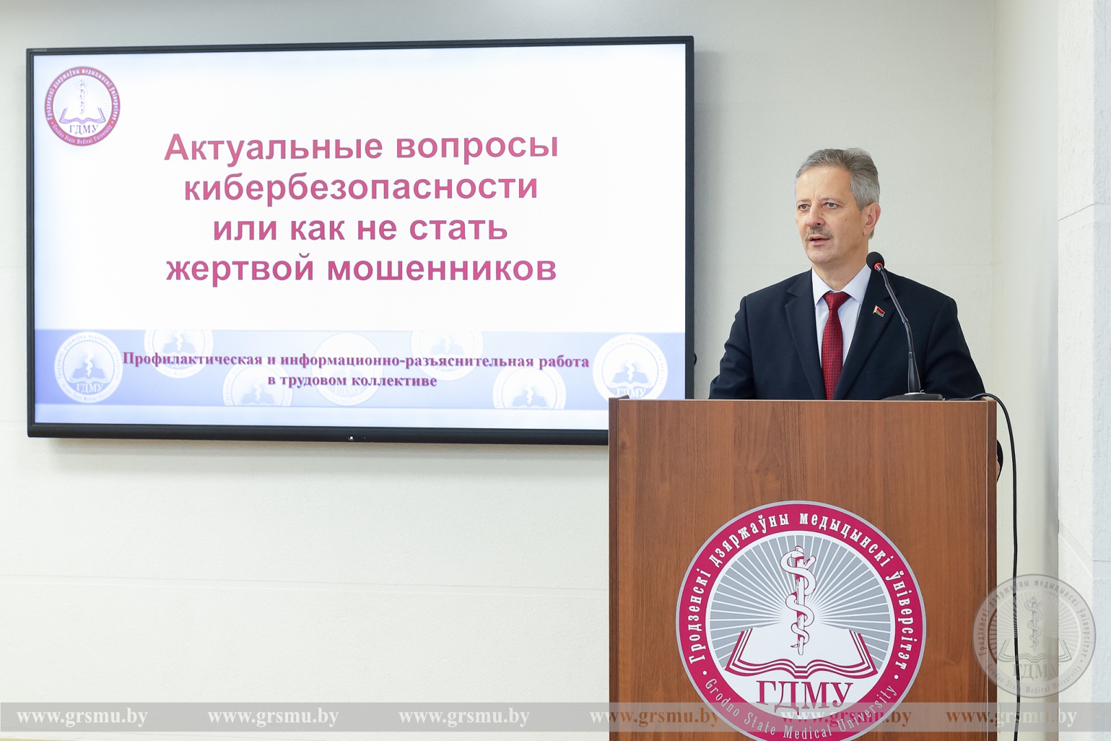 В Гродненском государственном медицинском университете продолжается цикл встреч руководства вуза с резервом руководящих кадров. Сегодня перед слушателями выступили проректор по безопасности, режиму и кадрам Владимир Александрович Якута и начальник 4‑го следственного отделения Гродненского межрайонного отдела Следственного комитета Республики Беларусь Дмитрий Зиновьевич Варварив. Главной темой обсуждения стали актуальные вопросы кибербезопасности и способы защиты от мошеннических схем в цифровой среде.