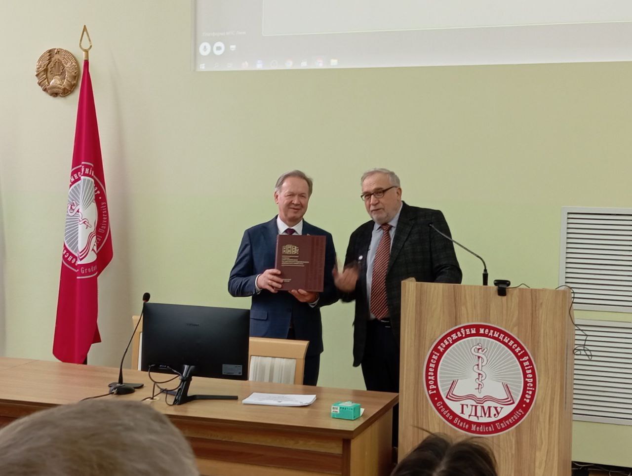Профессор Михаил Дмитриевич, наряду с теплыми приветственными словами от лица руководства Петербургского педиатрического института, передал в библиотеку ГрГМУ книгу, посвященную истории Педиатрического медицинского института.