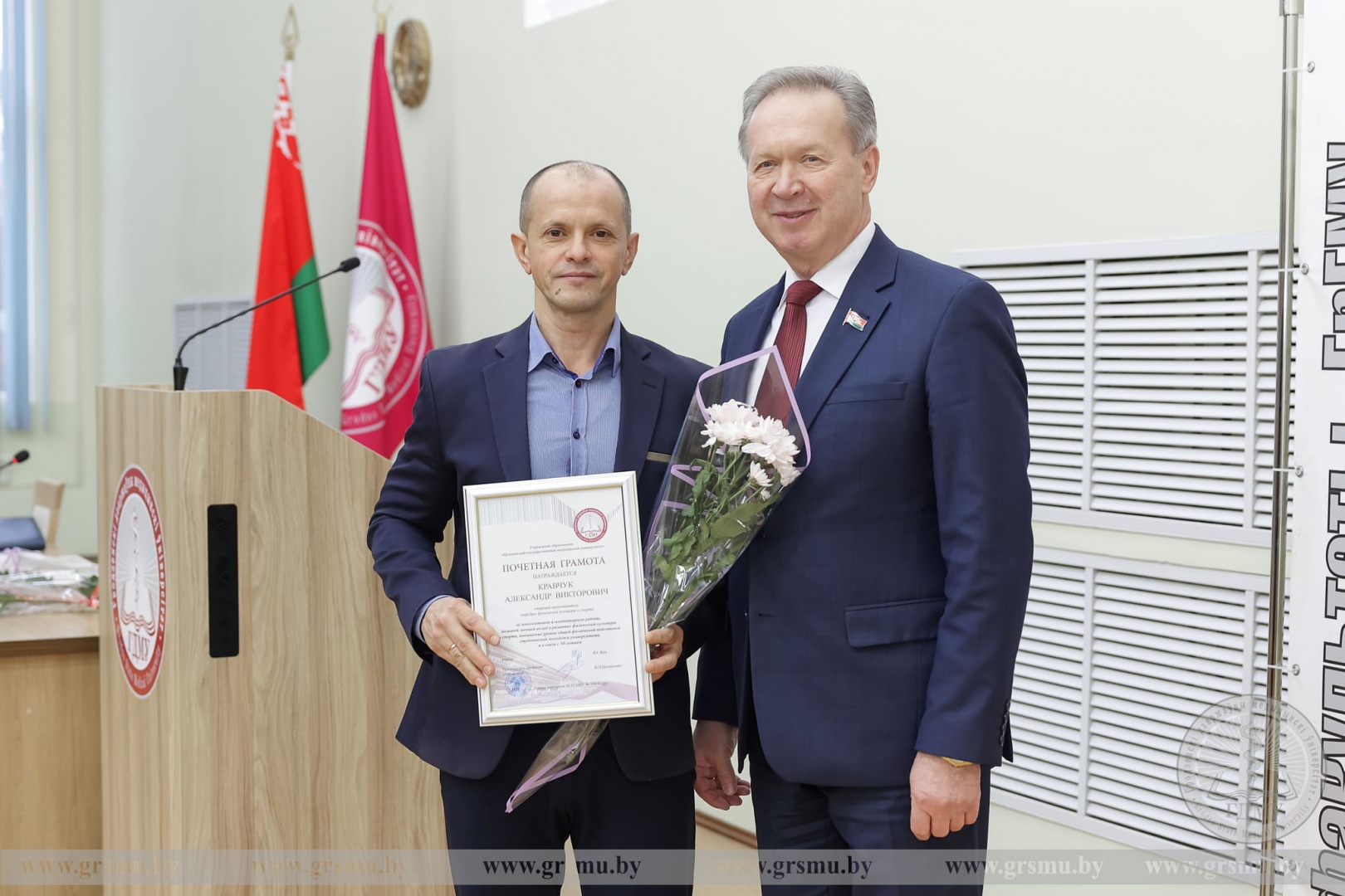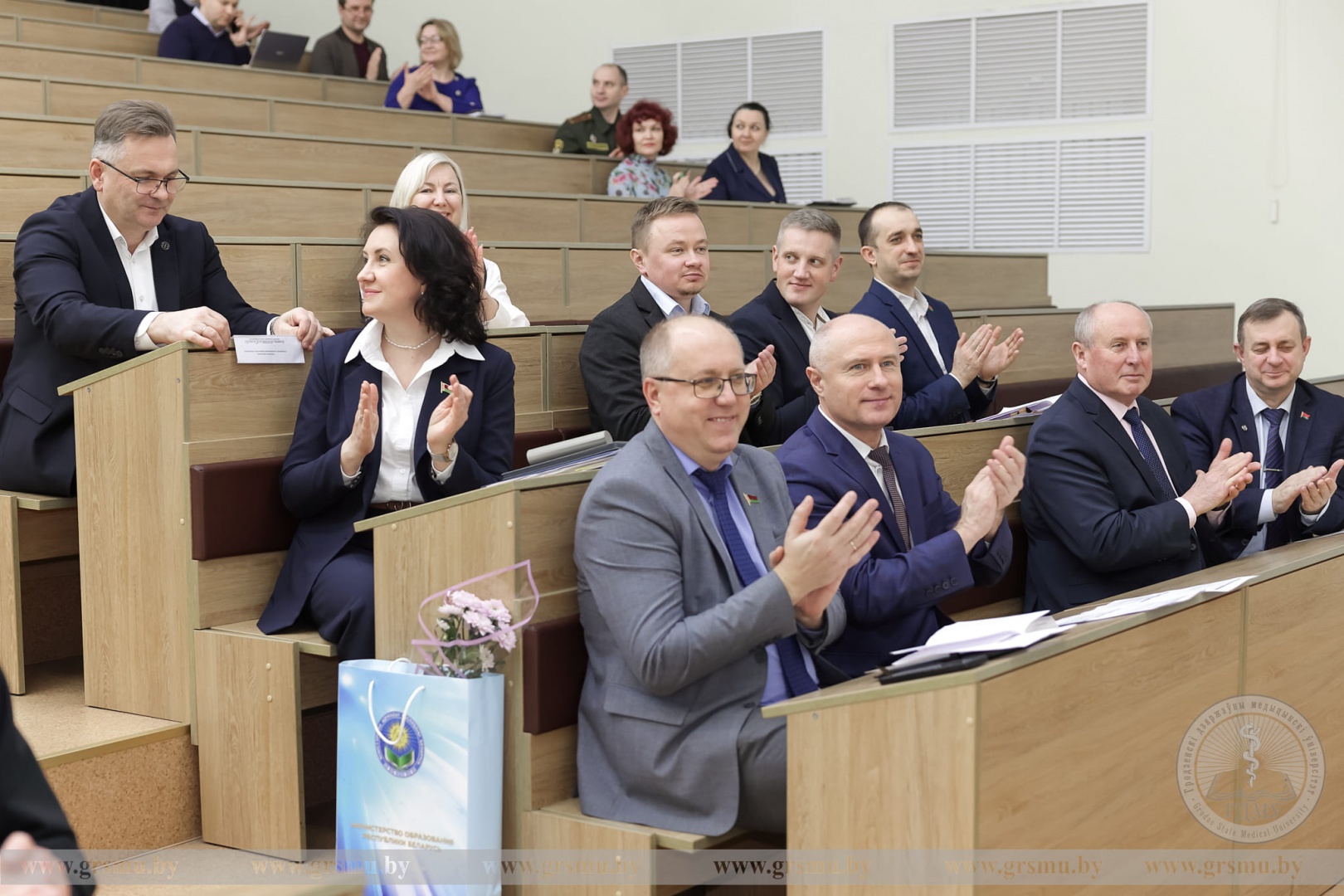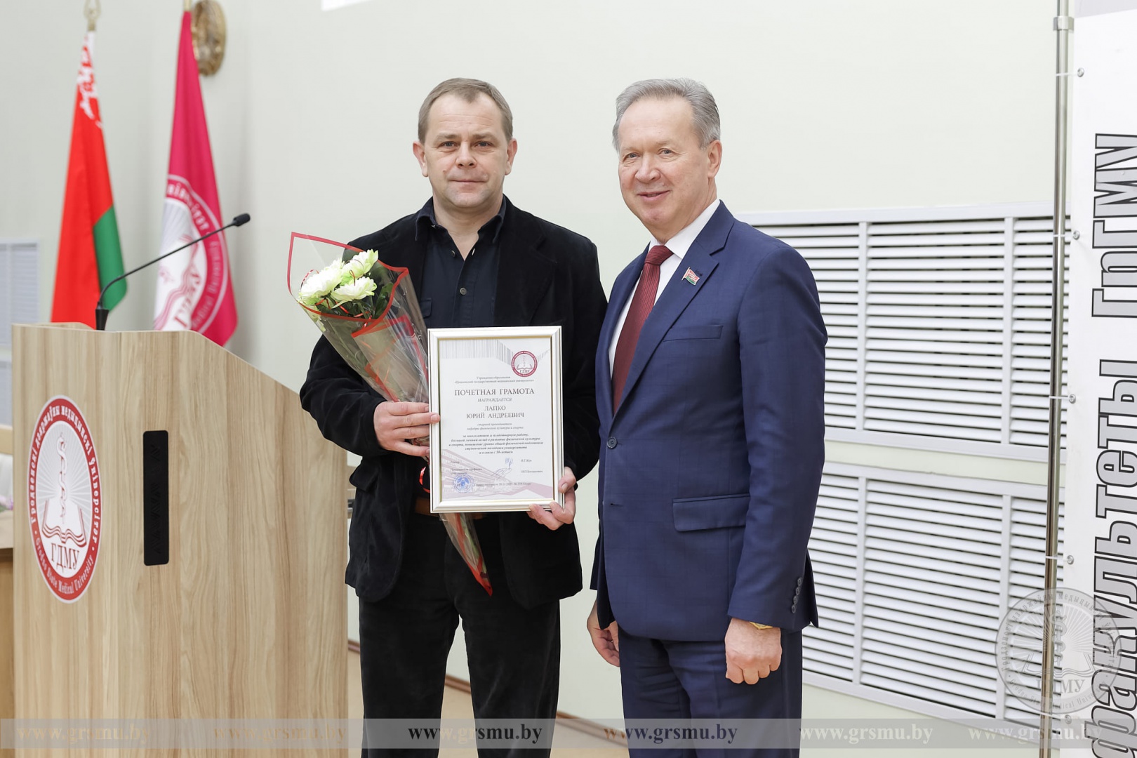 По традиции начало заседания было посвящено церемонии награждения сотрудников университета. Почетной грамотой учреждения образования «Гродненский государственный медицинский университет» были удостоены: доцент кафедры оториноларингологии и глазных болезней Светлана Николаевна Ильина, заведующий этой же кафедрой Олег Генрихович Хоров, старшие преподаватели кафедры физического воспитания и спорта Александр Викторович Кравчук и Юрий Андреевич Лапко, а также специалист 2‑й кафедры хирургических болезней Елена Чеславовна Никитина.