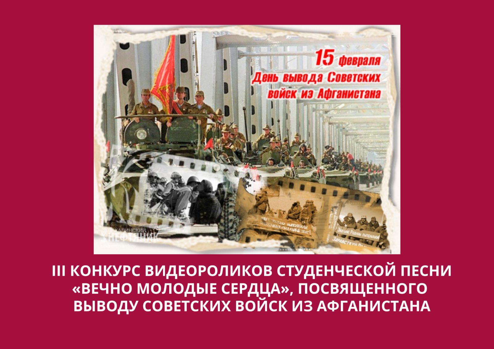 Гражданско-патриотический клуб кафедры социально-гуманитарных наук объявляет о старте III конкурса видеороликов студенческой песни «Вечно молодые сердца», посвященного выводу советских войск из Афганистана.