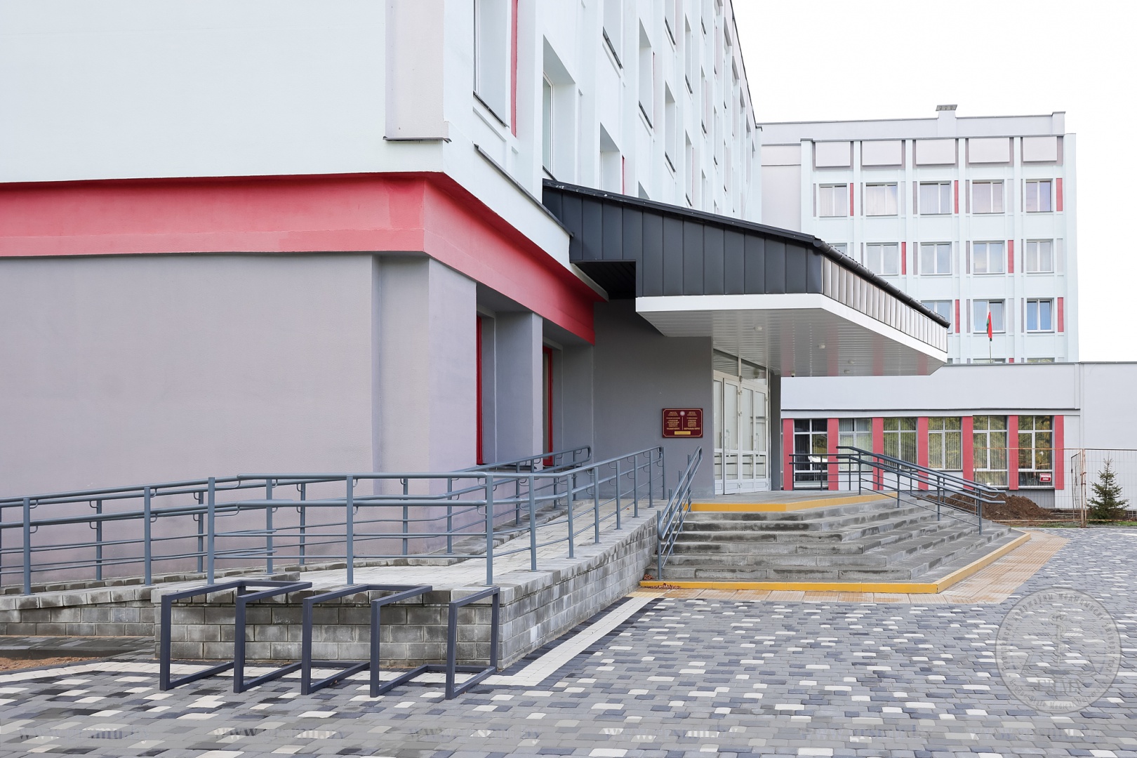 Обновлен пандус, установлены современные противопожарные двери, обустроены дождеприемные лотки. На территории вокруг корпуса выполнено благоустройство и озеленение.