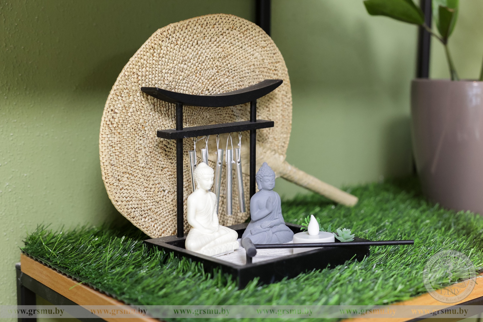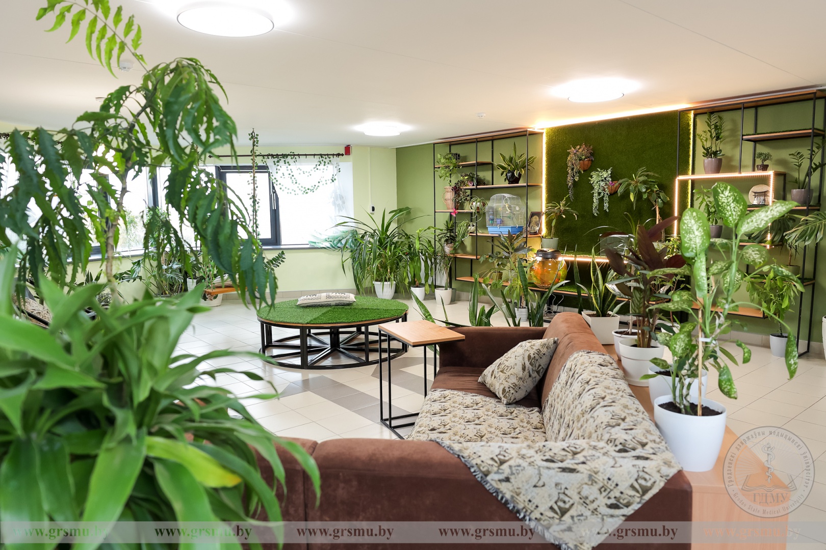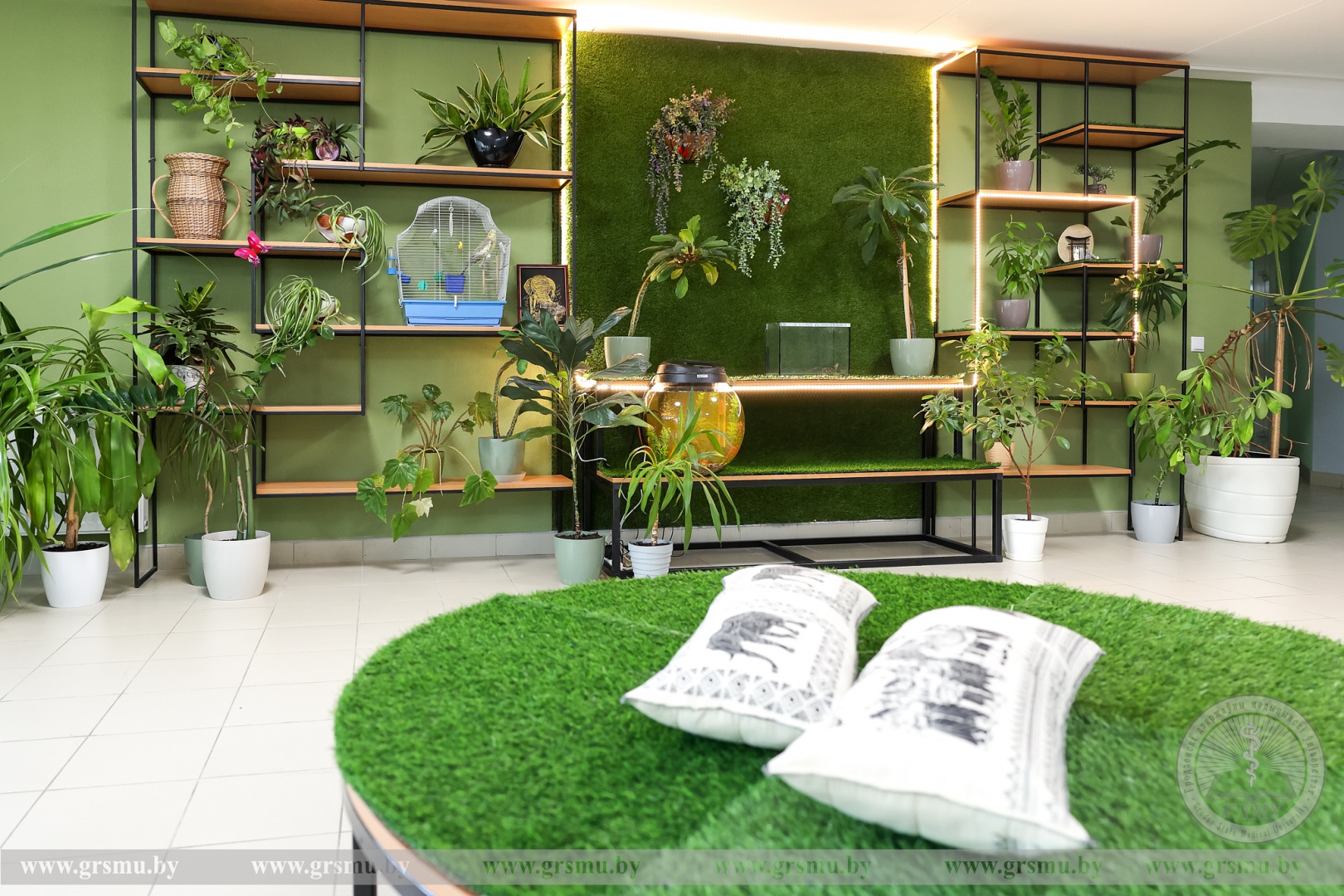 Зона отдыха «Зеленый оазис» оформлена на 10 этаже общежития в эко-стиле. При разработке и реализации проекта авторы, а это иностранные студенты Гродненского медицинского университета, руководствовались тем, что в общежитии проживает большое количество студентов из Шри-Ланки, Нигерии, Ганы, Кении, Либерии, т.е. ребята, которые привыкли к абсолютно другому климату, окружающей обстановке, и которые, находясь вдали от дома, часто испытывают тоску по Родине.