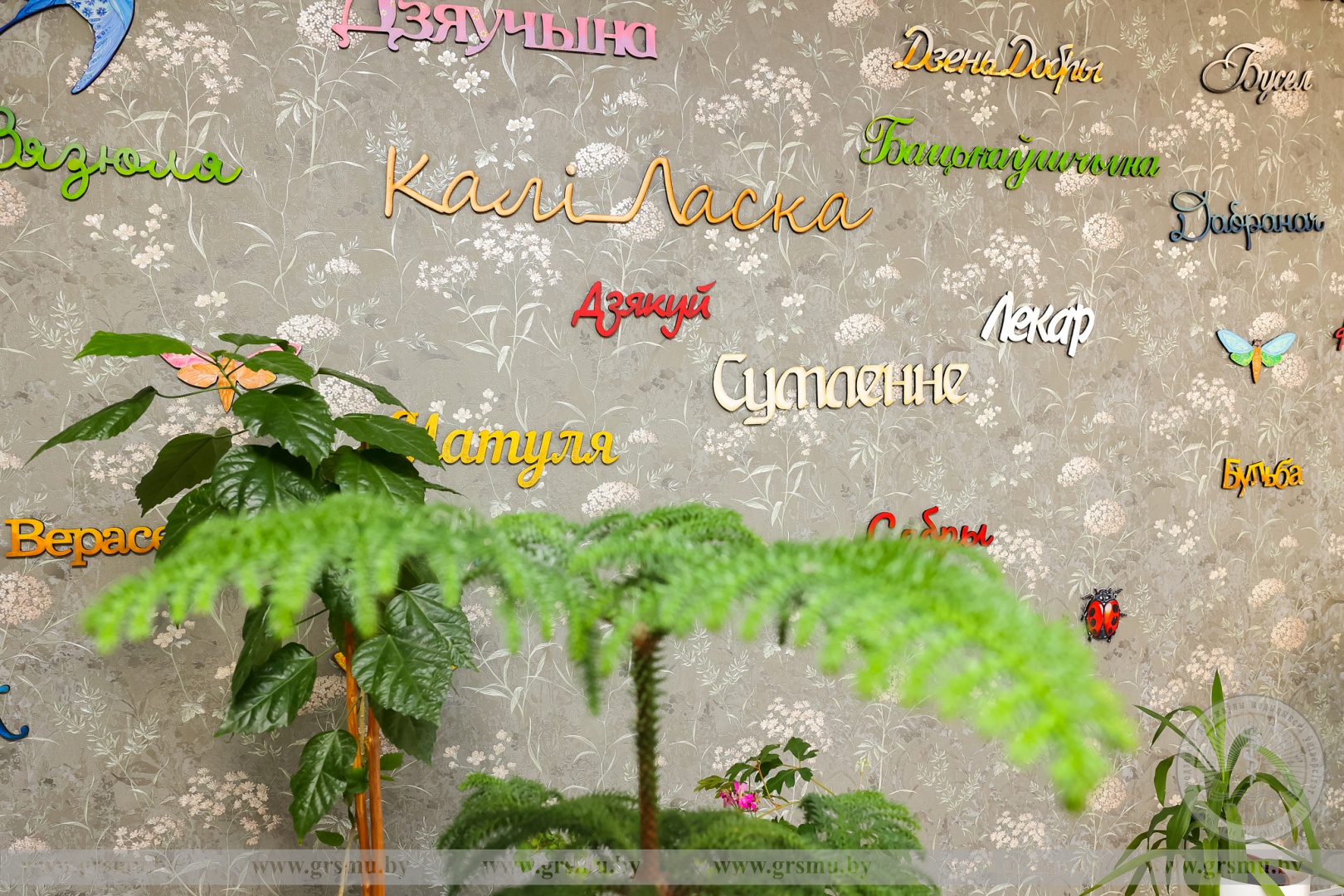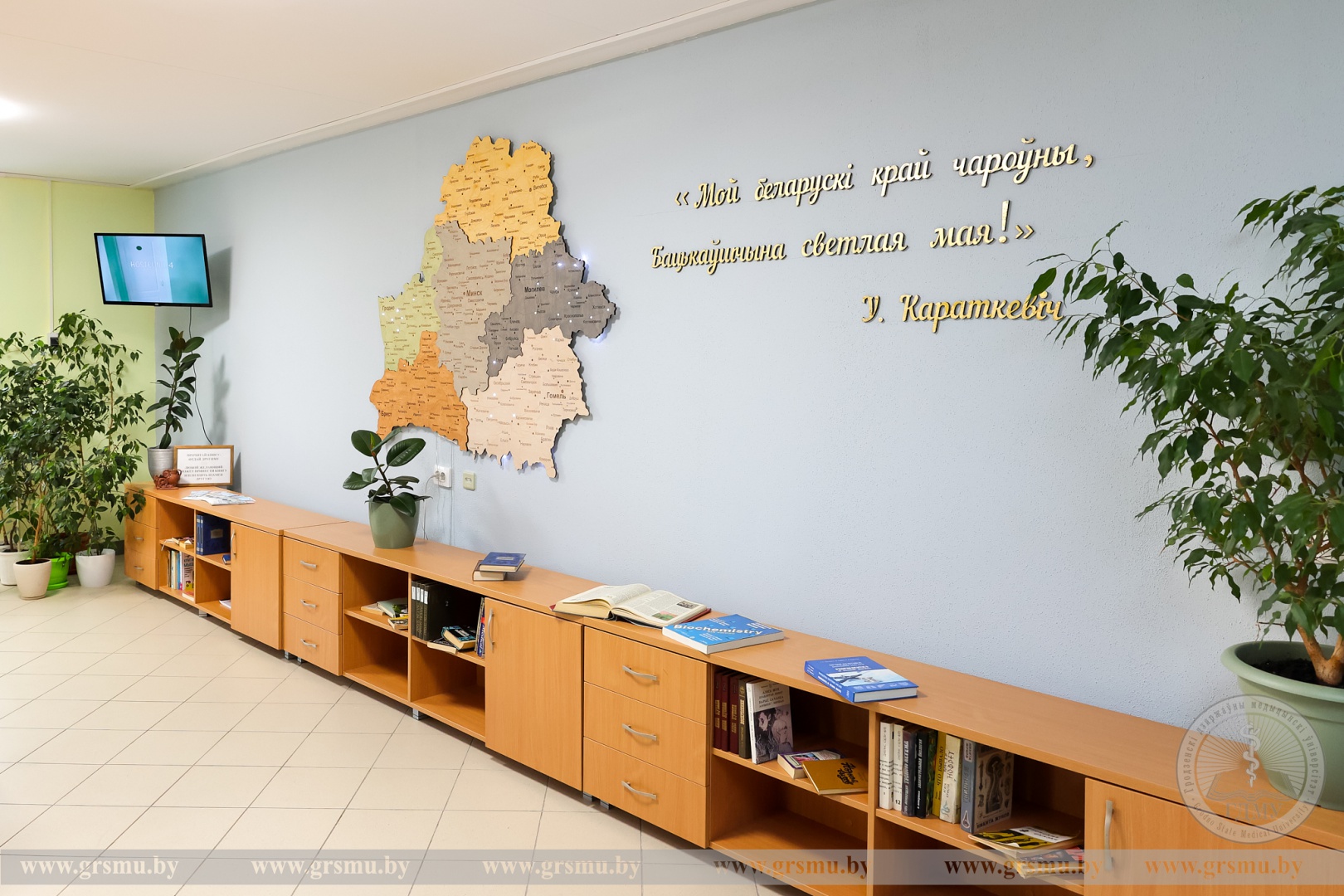 На противоположной стене, окрашенной в спокойный голубой цвет, размещена интерактивная карта Республики Беларусь с подсветкой обозначения некоторых городов и высказыванием В. Караткевича «Мой беларускі край чароўны, Бацькаўшчына светлая мая!».