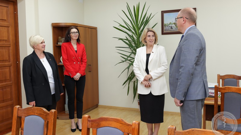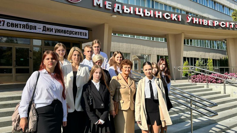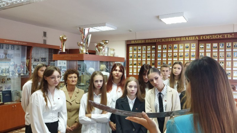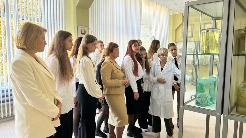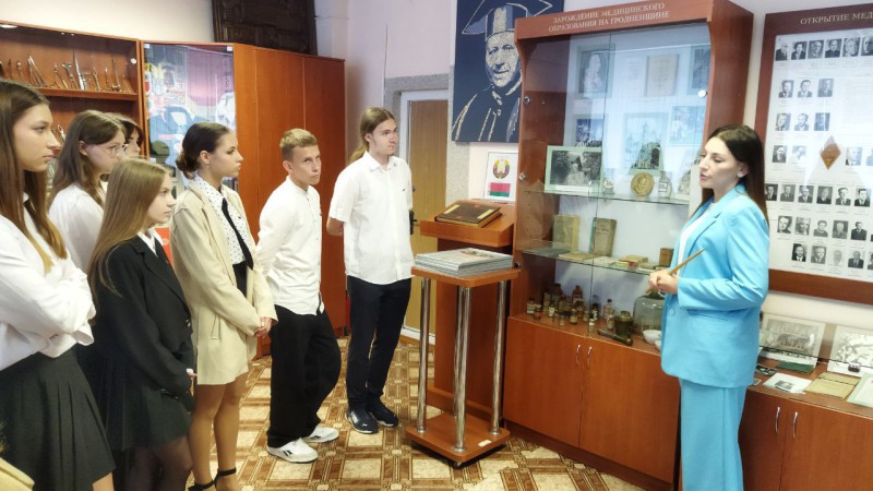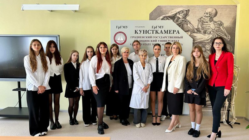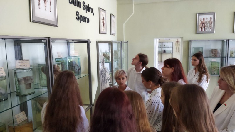 После подписания договоров для гостей и учеников средней школы и гимназии провели обзорную экскурсию по университету, показали музей истории ГрГМУ и экспозицию «Гродненская кунсткамера».