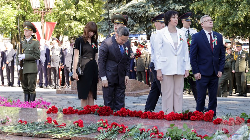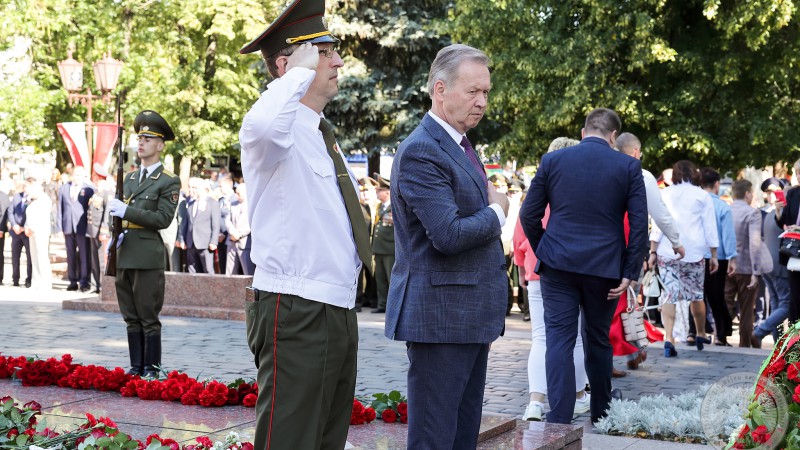 Торжественные мероприятия в Гродно начались с церемонии возложения цветов и венков к памятнику воинам и партизанам, погибшим в годы Великой Отечественной войны. В числе участников церемонии и руководство Гродненского государственного медицинского университета во главе с членом Совета Республики Национального собрания Республики Беларусь, ректором ГрГМУ Игорем Георгиевичем Жуком.