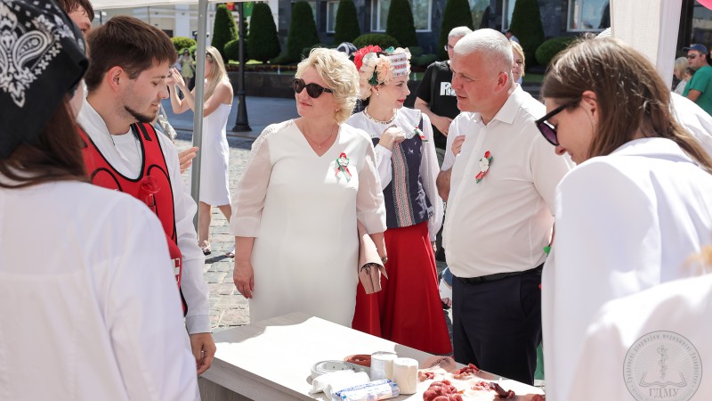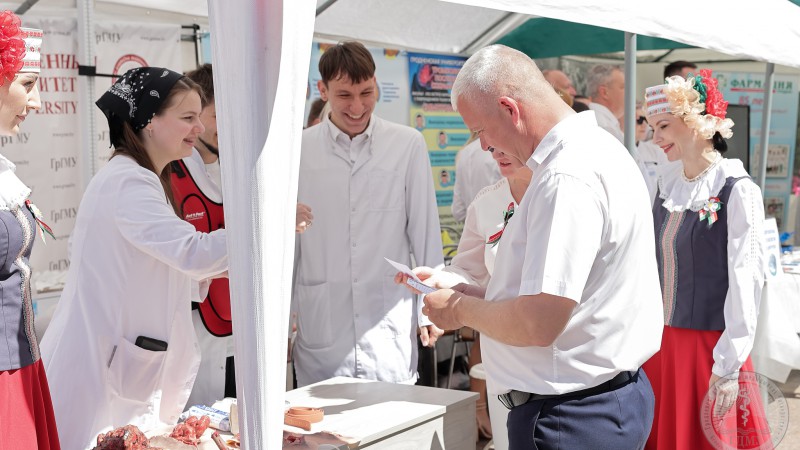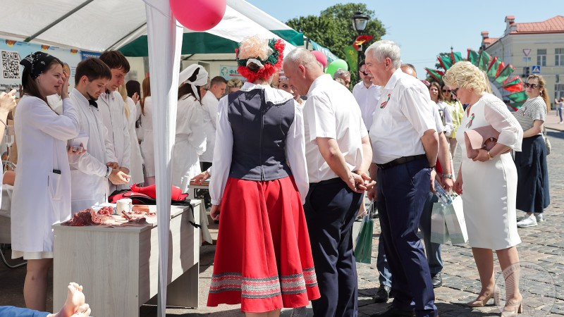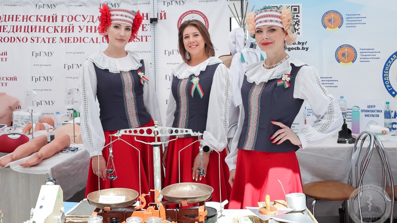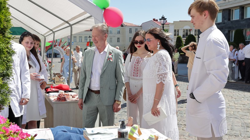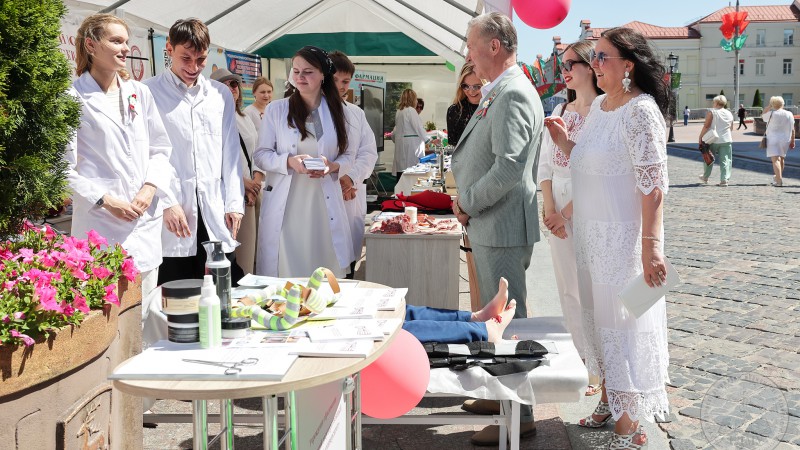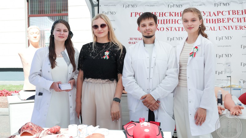 Ровно в полдень начали работу интерактивные площадки развития и достижений предприятий, организаций и учреждений Гродно. Здесь наш вуз совместно с РУП «Фармация» и УЗ «Гродненская университетская клиника» представили экспозиционно-выставочную площадку. Каждый желающий смог ознакомиться с наградами университета, научными достижениями наших ученых, которые внедрены в практическое здравоохранении страны, узнать вехи зарождения медицины на Гродненщине и ГрГМУ: от исторического прошлого к современному настоящему. Увидеть редкие, уникальные медицинские экземпляры инструментов, которые использовались в годы Великой Отечественной войны. Особое внимание гостей нашей локации привлекла выставка симуляционного оборудования, где каждый смог проверить свои знания по проведению сердечно-легочной реанимации, изучить анатомию человека и получить компетентные советы от наших студентов – будущих врачей.