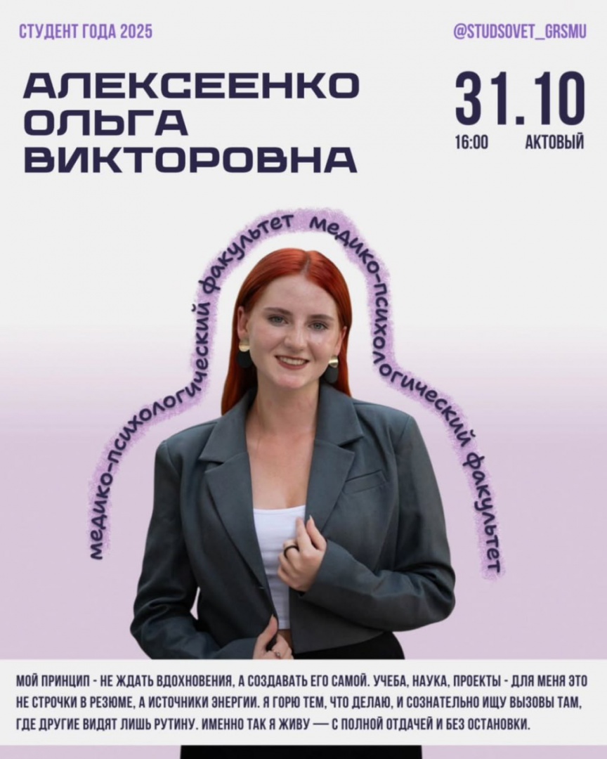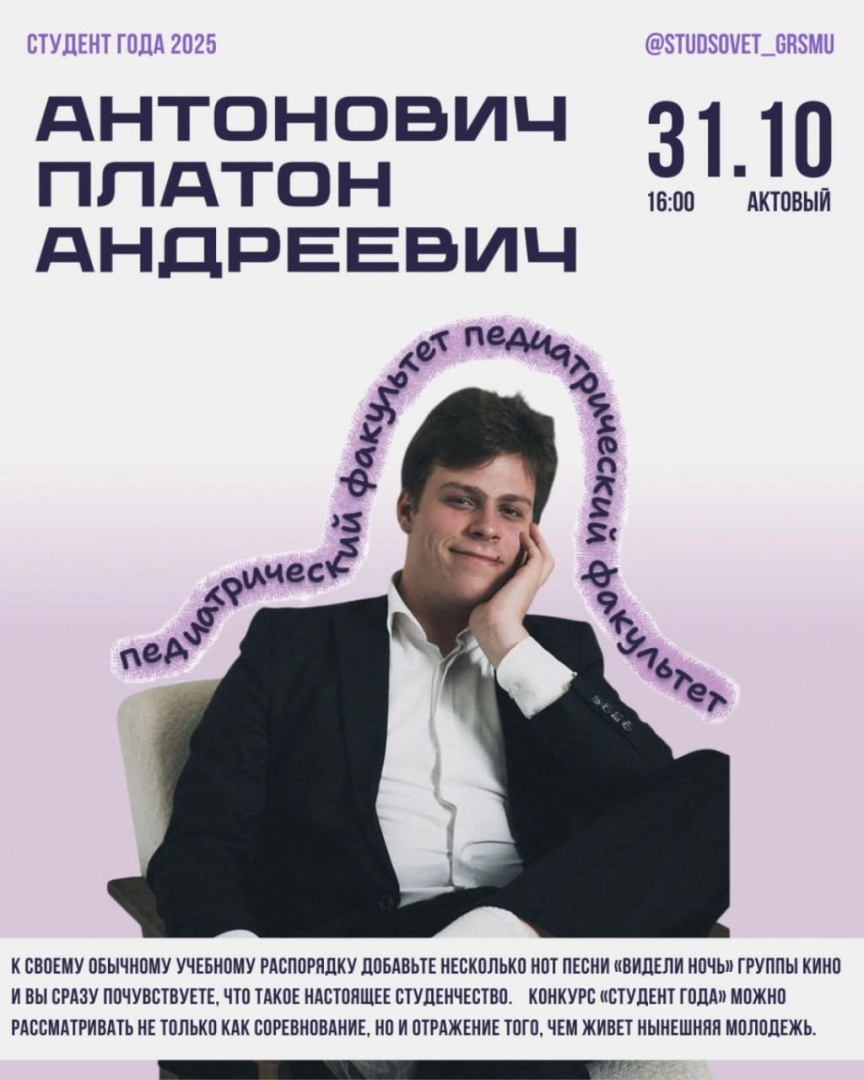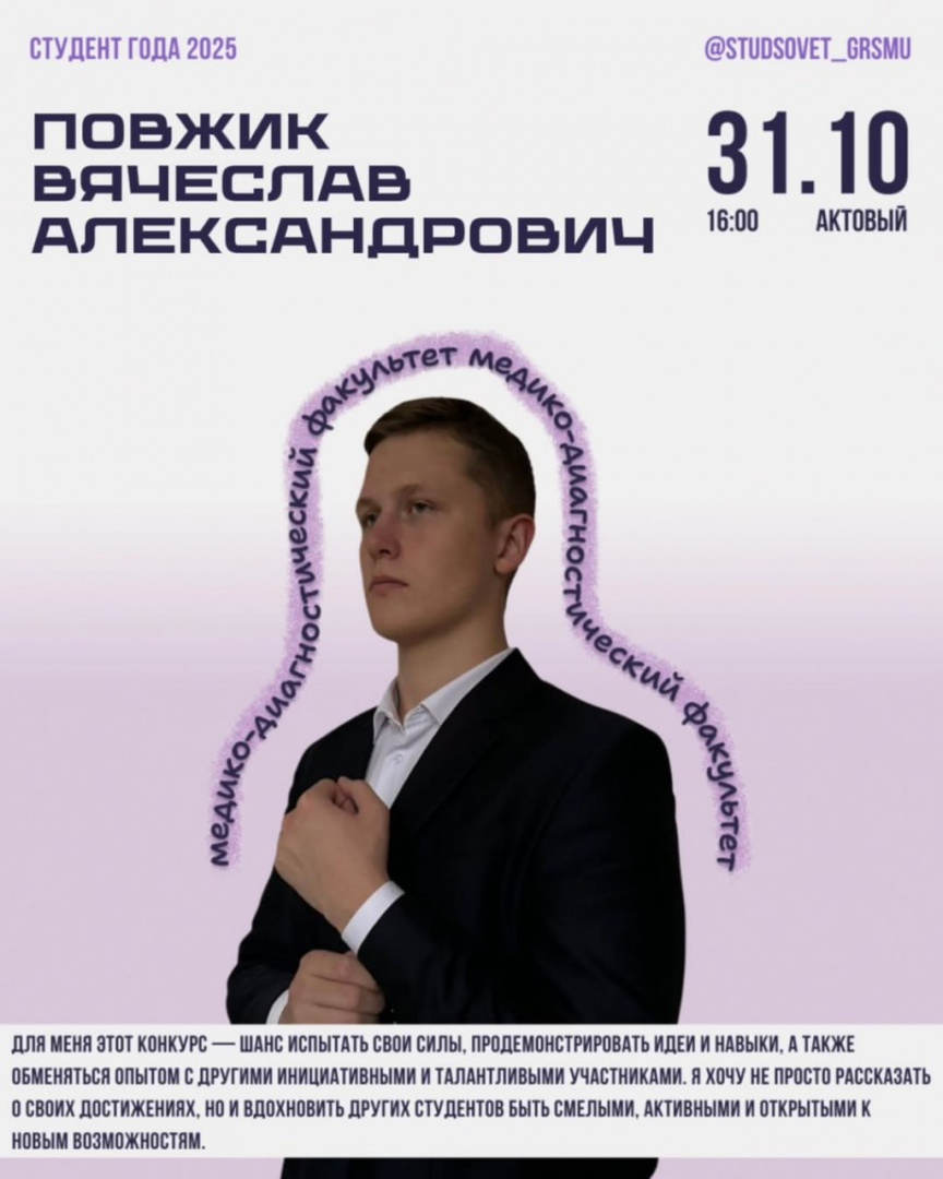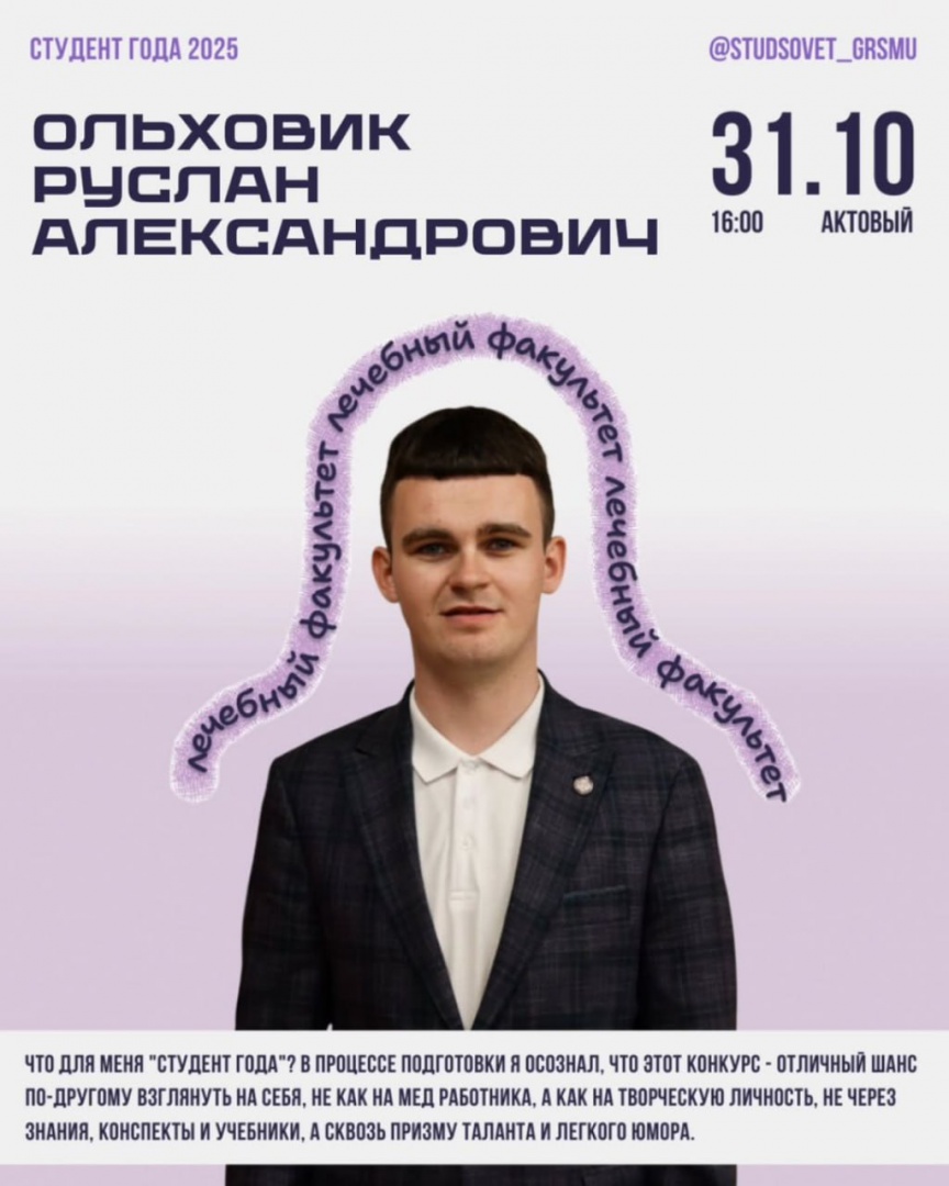 За победу и право представить наш университет на областном этапе «Студент года-2025» поборются 4 студента. Студенческий совет ГрГМУ ближе знакомит с конкурсантами.
