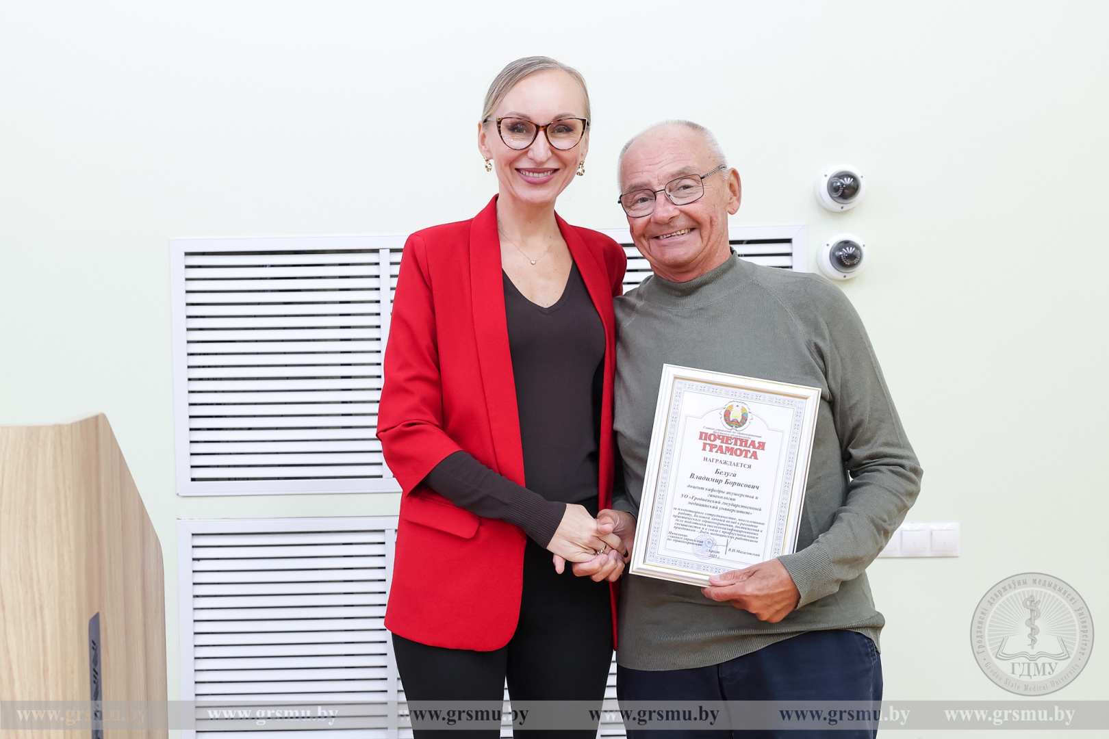 В рамках круглого стола за плодотворное сотрудничество, многолетнюю работу, большой личный вклад в развитие практического здравоохранения, достижения в деле подготовки высококвалифицированных специалистов и в связи с профессиональным праздником – Днем медицинского работника – доценту кафедры акушерства и гинекологии Владимиру Борисовичу Белуге вручена Почетная грамота.