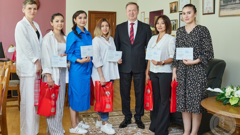 Сегодня у девушек заключительный день стажировки. Сертификаты об окончании обучения в Гродненском медицинском университете вручил ректор Игорь Георгиевич Жук.