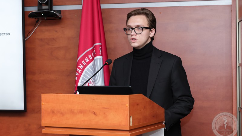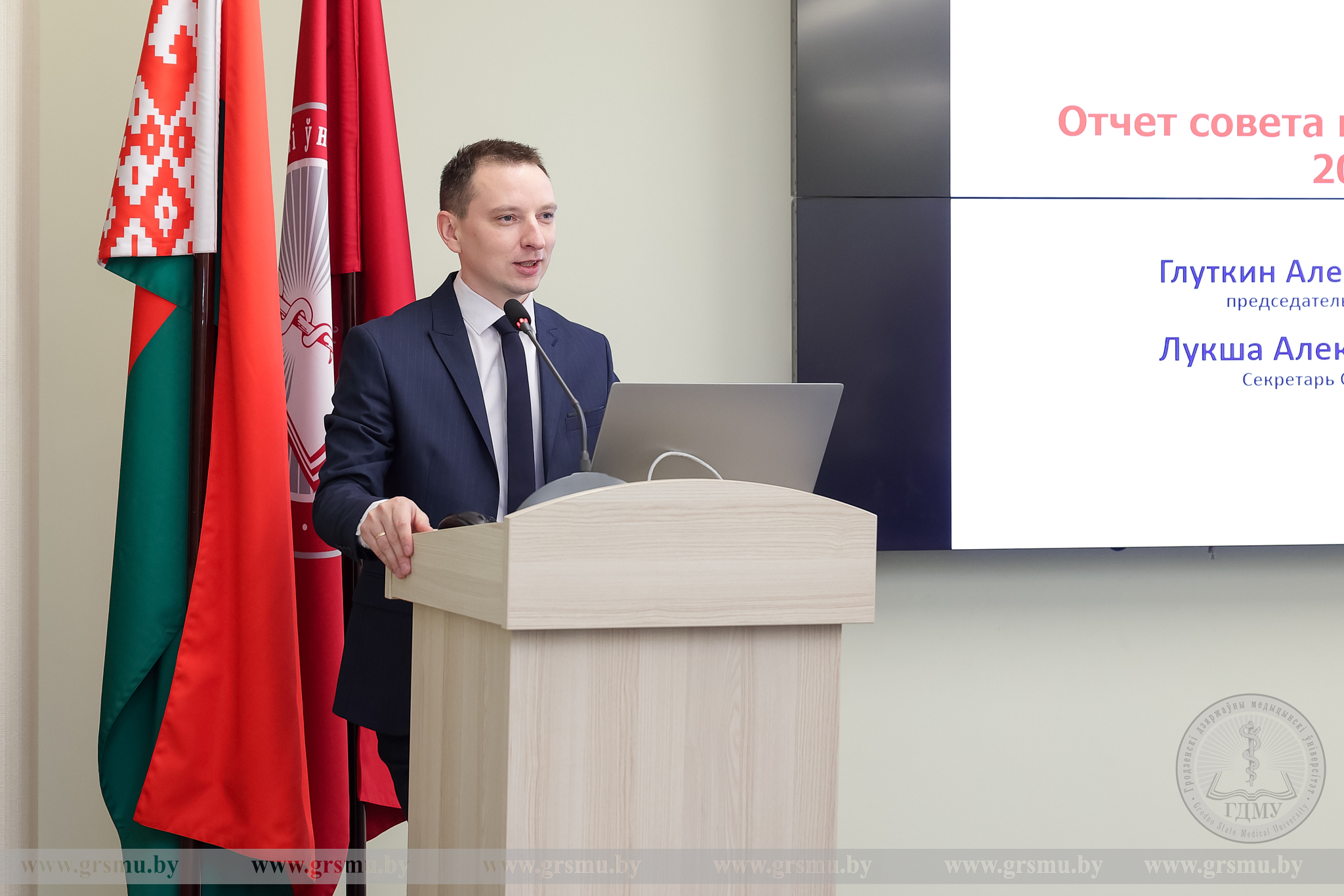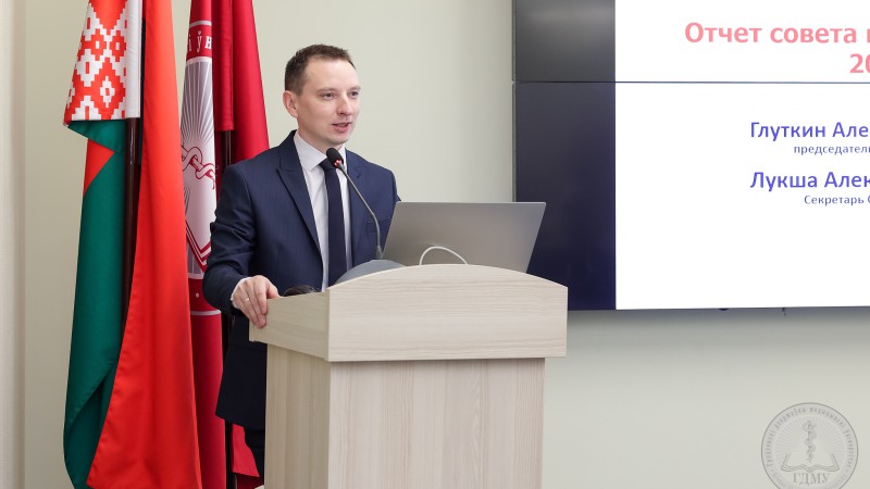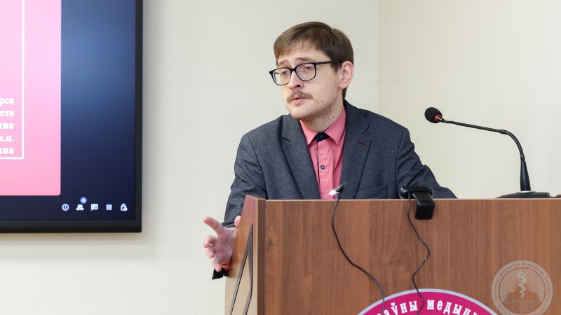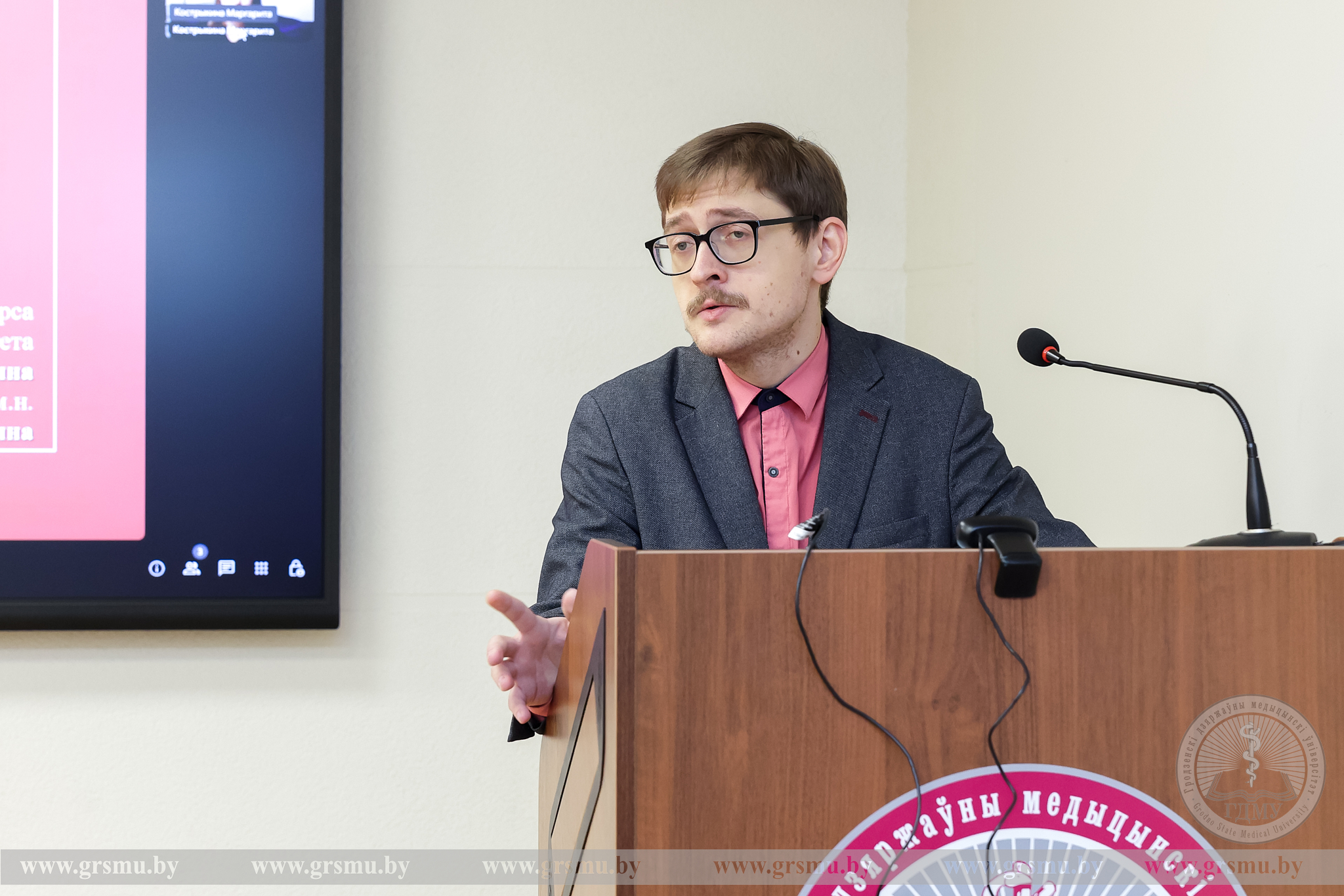 После торжественного открытия с развернутым докладом об итогах работы Совета молодых ученых за 2025 год выступил секретарь Совета, доцент 1‑й кафедры детских болезней Александр Викторович Лукша,