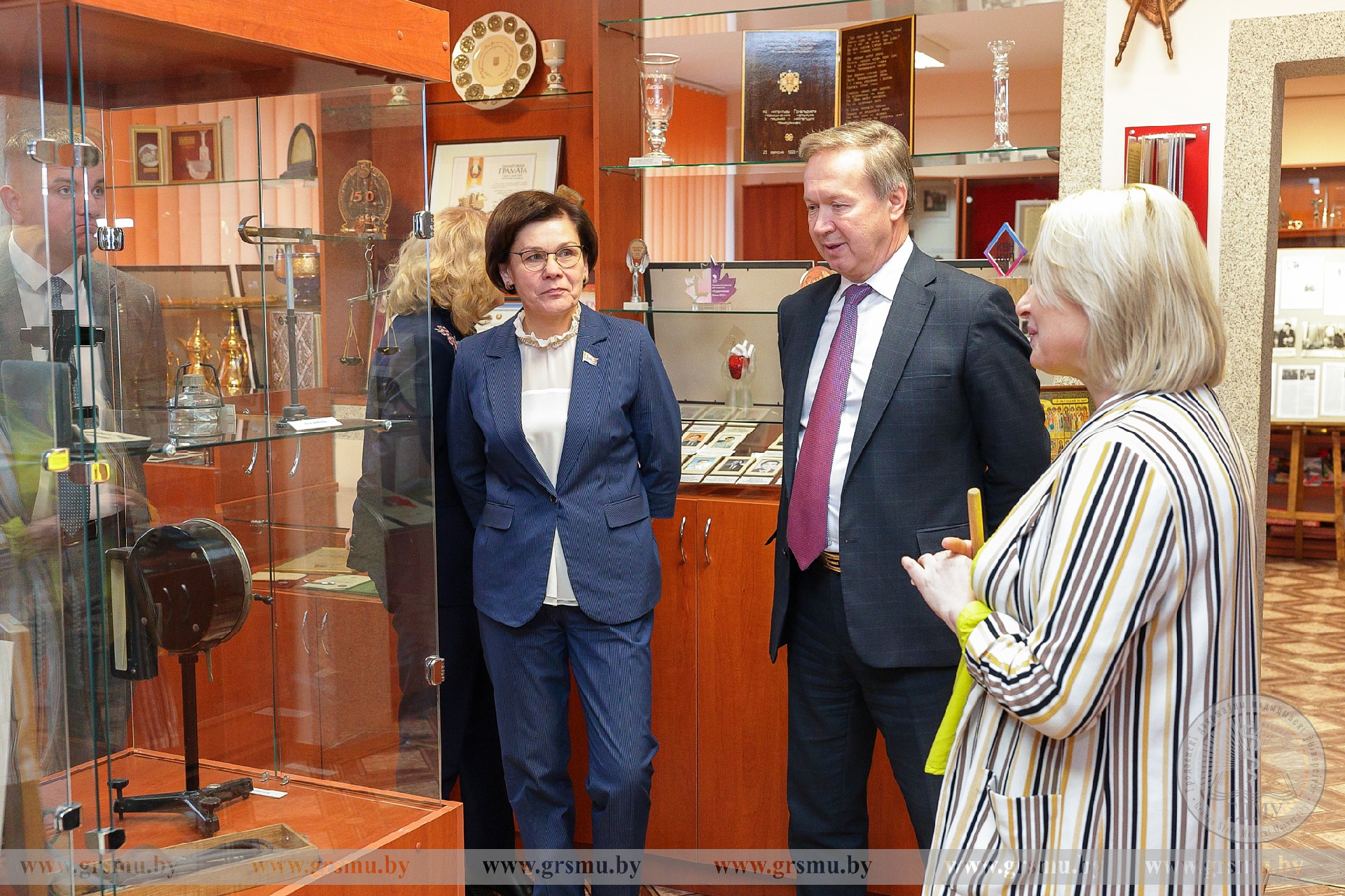 После подписания договора о сотрудничестве была организована экскурсия по главному корпусу и посещение музея истории ГрГМУ. Здесь гостям рассказали историю зарождения медицинского образования на Гродненщине, в частности, на эксклюзивных фотокарточках показали историю медуниверситета от прошлого к современности, а также познакомили с уникальными экспозициями, размещенными в музее. В конце встречи гости поблагодарили руководство университета за теплый прием.