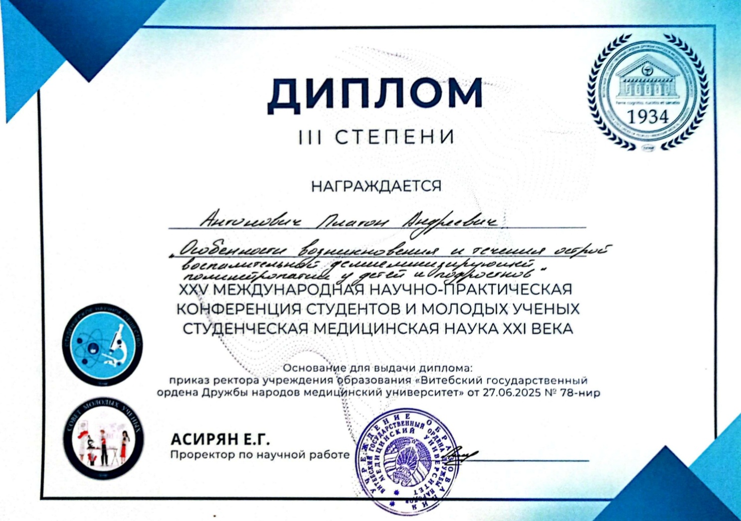 Студенты педиатрического факультета ГрГМУ – призеры XXV Международной научно-практической конференция студентов и молодых ученых