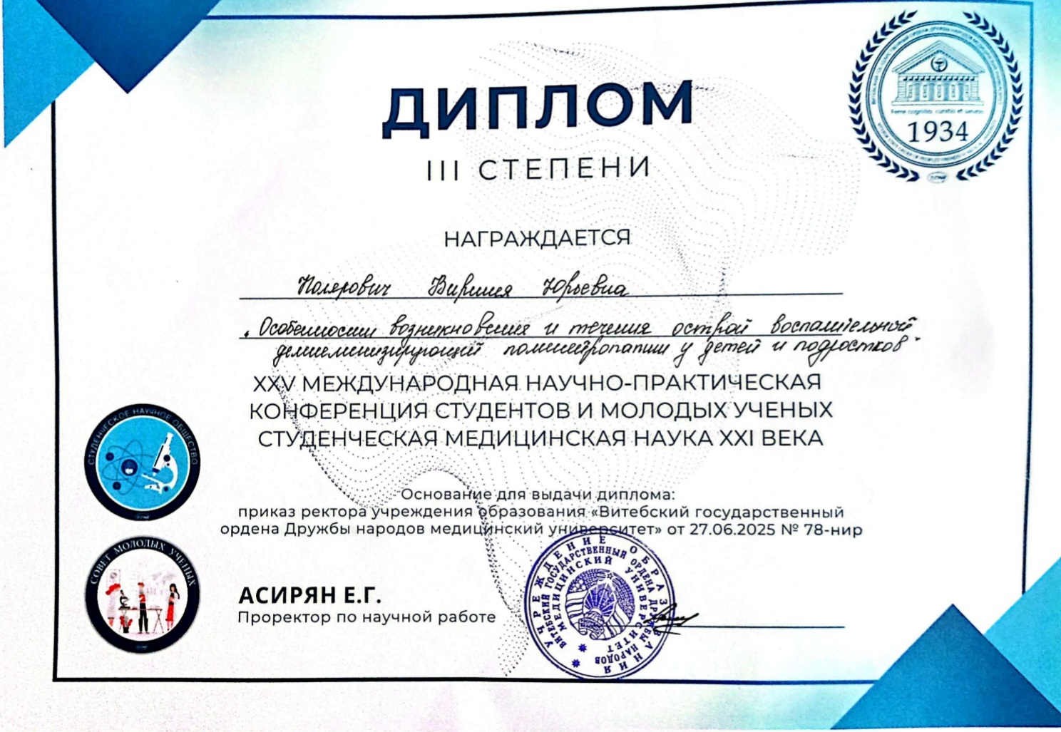 23-24 октября 2025 года на базе Витебского государственного медицинского университета и его клинических базах состоялась XXV Международная научно-практическая конференция студентов и молодых ученых «Студенческая медицинская наука XXI века». В конференции приняли участие представители медицинских вузов Республики Беларусь и стран ближнего зарубежья.