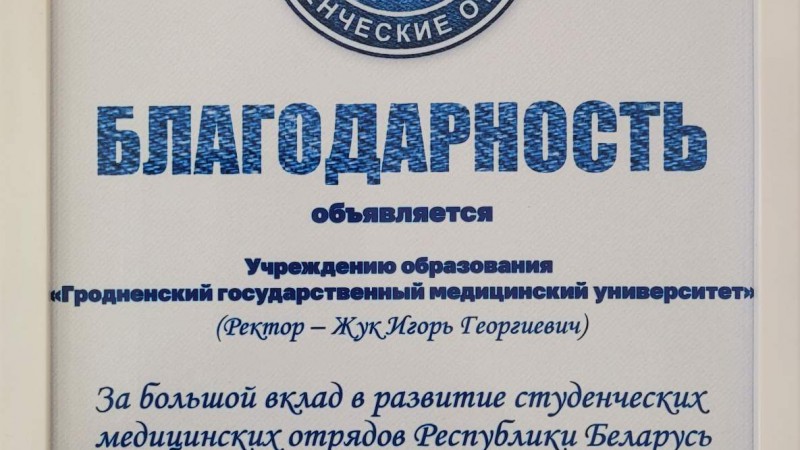 Гродненскому государственному медицинскому университету и ректору профессору Игорю Георгиевичу Жуку Центральным комитетом ОО БРСМ объявлена благодарность за большой вклад в развитие студенческих медицинских отрядов Республики Беларусь.