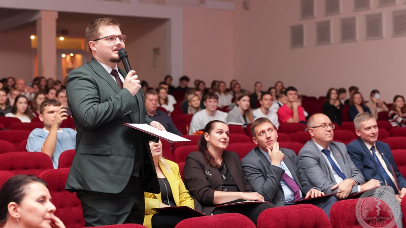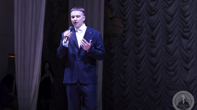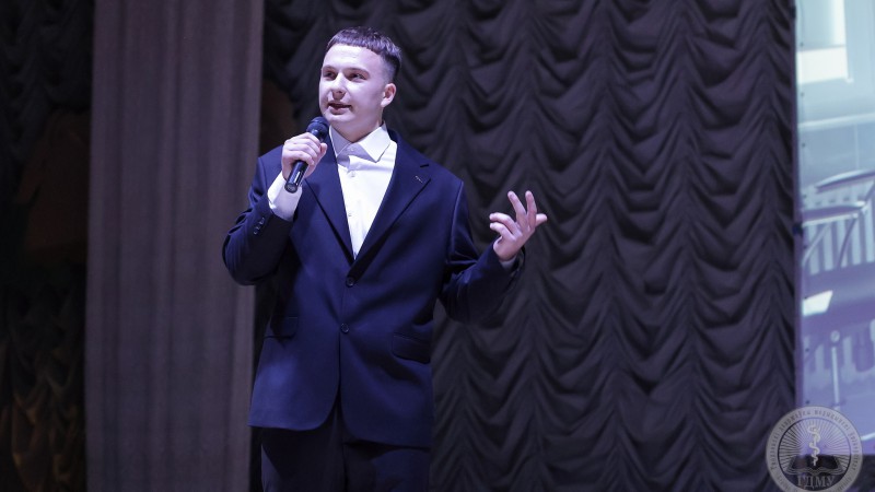 Вслед за Полиной на сцену вышел представитель медико-диагностического факультета Егор Борко. Для зрителей молодой человек подготовил видеовизитку, в которой рассказал о своем пути в медицину, любви к спорту и личных достижениях.