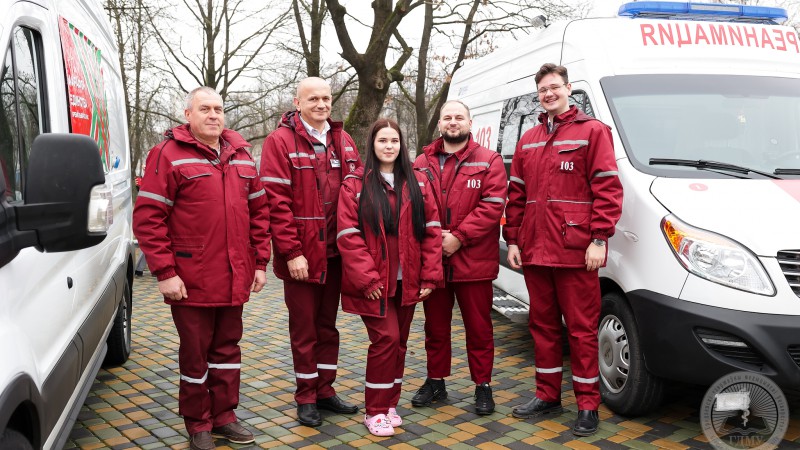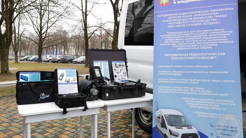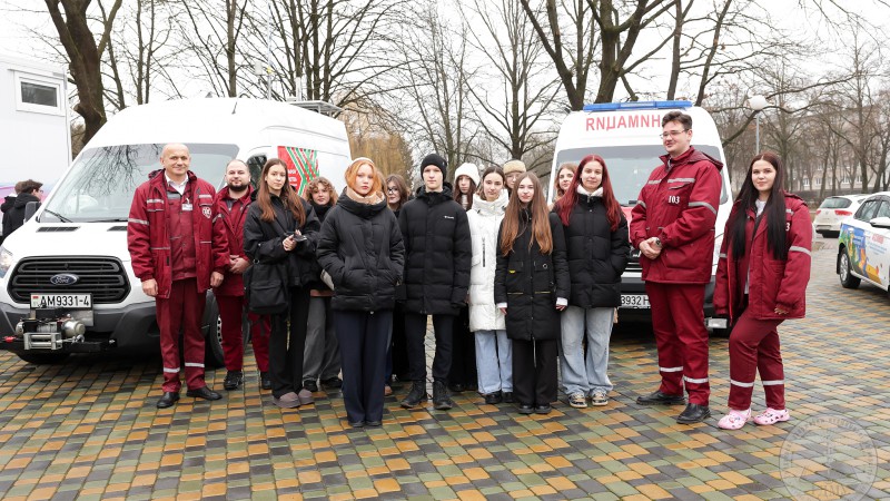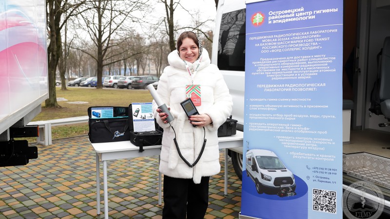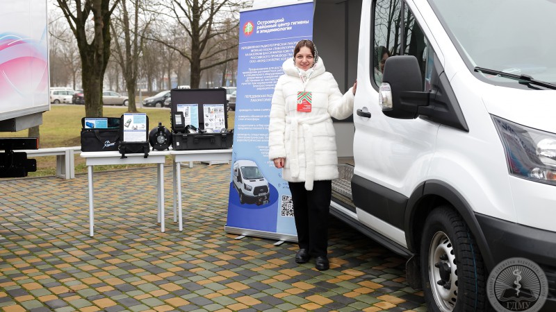 Часть экспозиции выставки «Беларусь. Медицина. Будущее» располагалась и на улице, возле главного входа в корпус вуза. Здесь показаны современная машина скорой медицинской помощи, передвижной ФАП, кабинет рентгенодиагностический передвижной «Маммоэкспресс», радиологическая лаборатория.