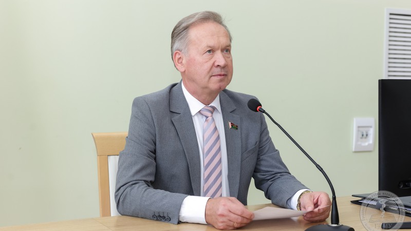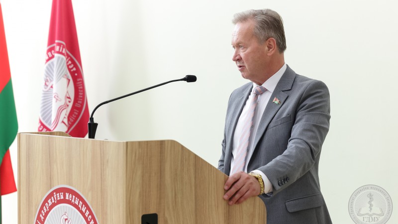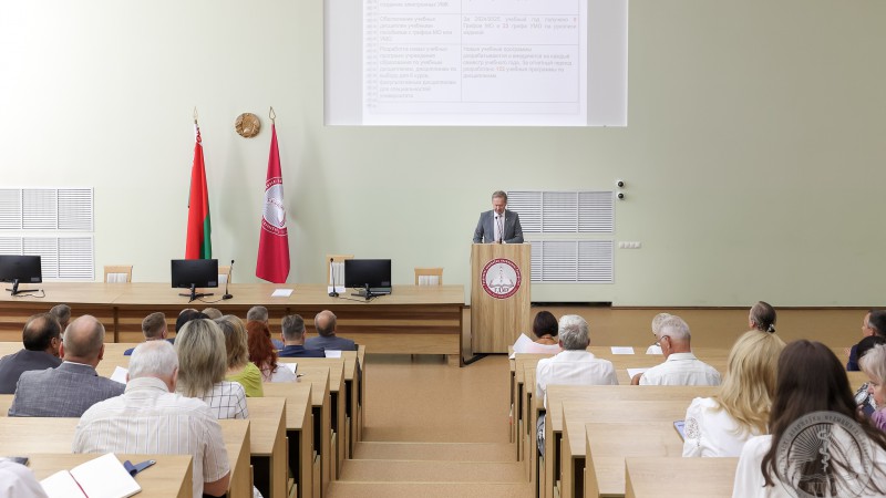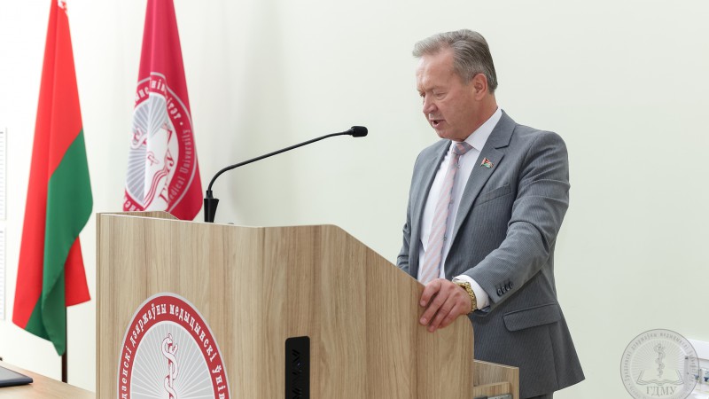 Далее первый проректор Андрей Викторович Болтач выступил с докладом об утверждении плана деятельности учреждения образования «Гродненский государственный медицинский университет» на 2025/2026 учебный год.
