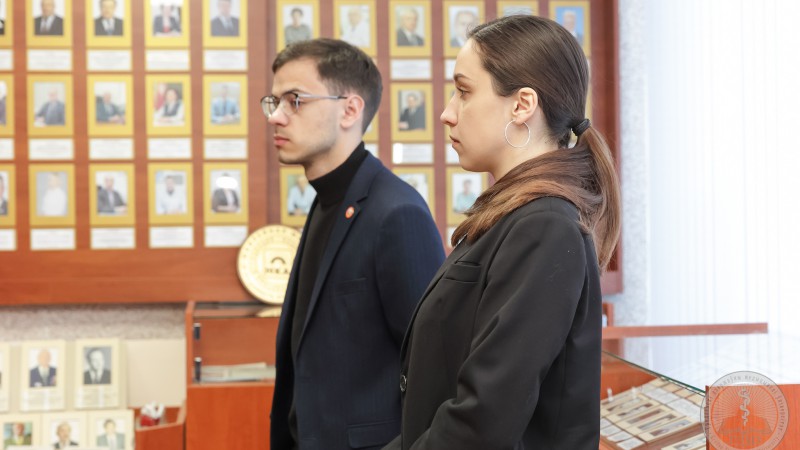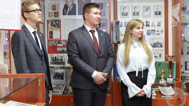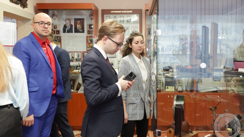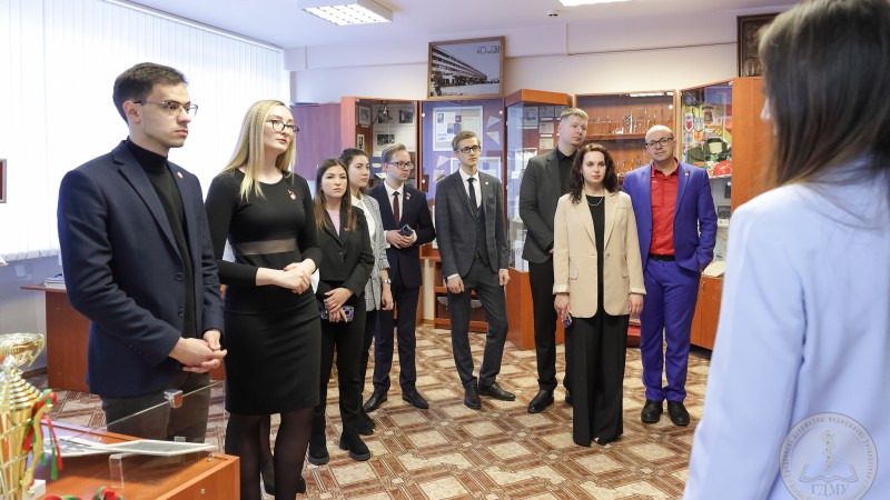 Перед началом заседания делегация посетила и музей истории ГрГМУ. Заведующий музеем Яна Витальевна Законникова рассказала об истории вуза, наградах и достижениях, а также о тех, кто стоял у истоков зарождения медицинского образования на Гродненщине.