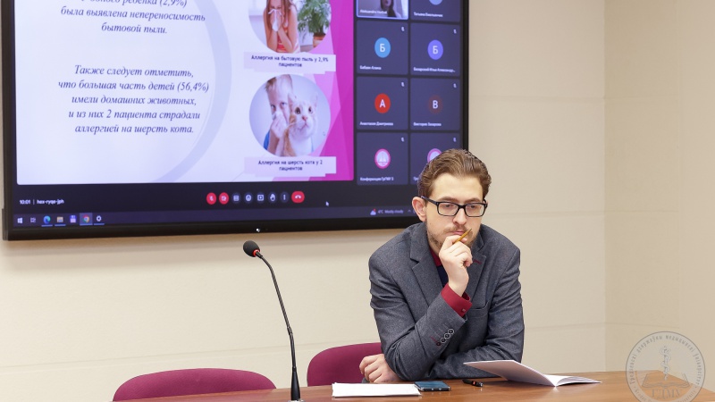 После торжественного открытия конференции Александр Викторович выступил с докладом «Итоги работы Совета молодых учёных за 2023 год». В своем выступлении он рассказал о структуре СМУ, организационном процессе, отметил достижения молодых ученых за год, а также рассказал о дальнейших планах по работе и взаимодействию с коллегами.