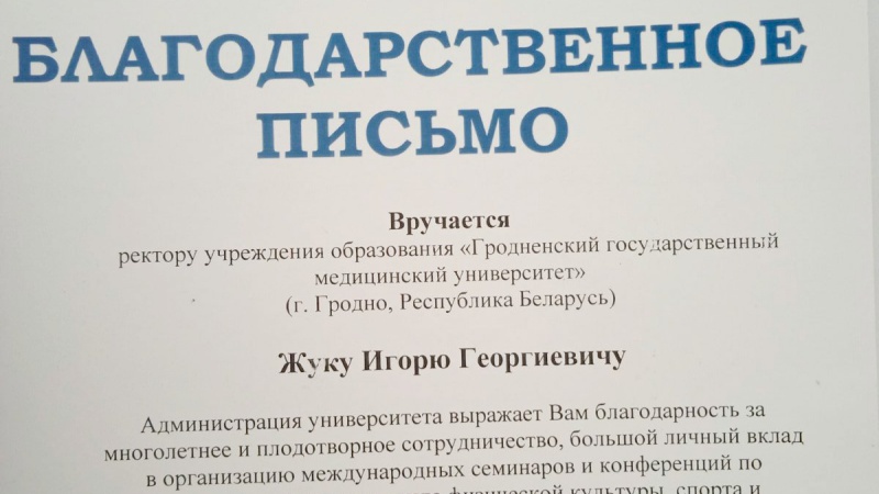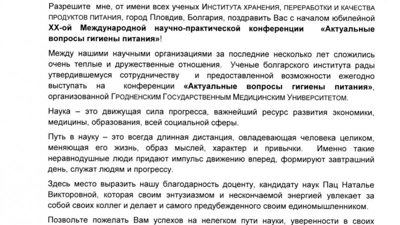 В адрес конференции также пришло благодарственное письмо от администрации Сибирского государственного университета имени М.Ф.Решетнева (Красноярск) с благодарностью ректору ГрГМУ Игорю Георгиевичу Жуку за возможность организации на платформе нашего университета крупнейшего научного форума, и доценту Пац Наталии Викторовне – за подключение университетов различных профилей обучения к участию в обсуждении современных вопросов науки и практики в области гигиены питания.