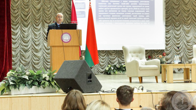 Участие в диалоговой площадке приняло руководство вуза, деканы, профессорско-преподавательский состав и студенты ГрГМУ. Перед присутствующими выступил заместитель прокурора Гродненской области Андрей Николаевич Скурат. Тема сегодняшней встречи – геноцид населения Беларуси во время Великой Отечественной войны и послевоенный период.