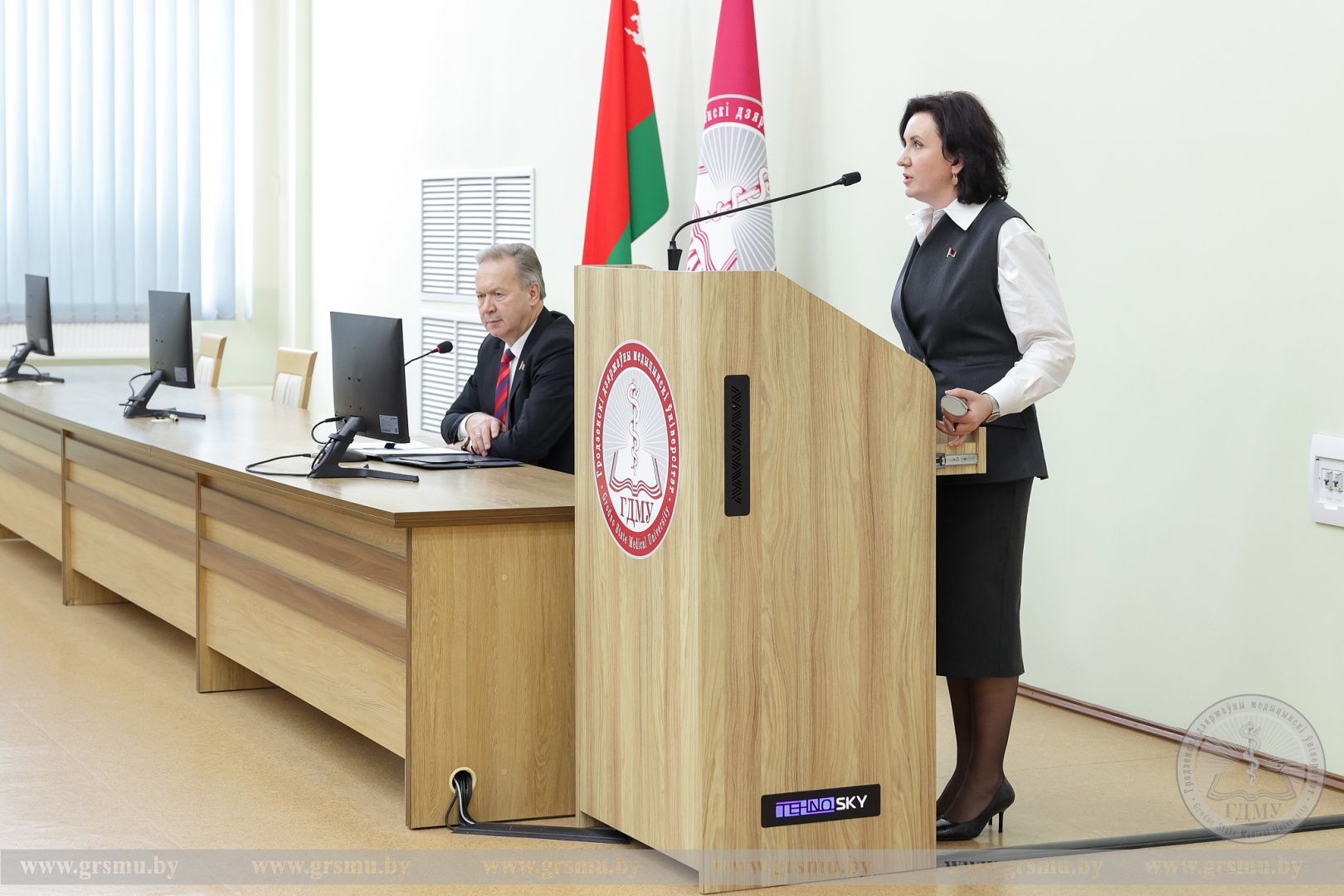 С докладом о ходатайстве перед ВАК Республики Беларусь о присвоении ученого звания доцента доценту кафедры нормальной анатомии Ольге Анатольевне Горустович выступила секретарь совета университета, профессор Марина Юрьевна Сурмач.