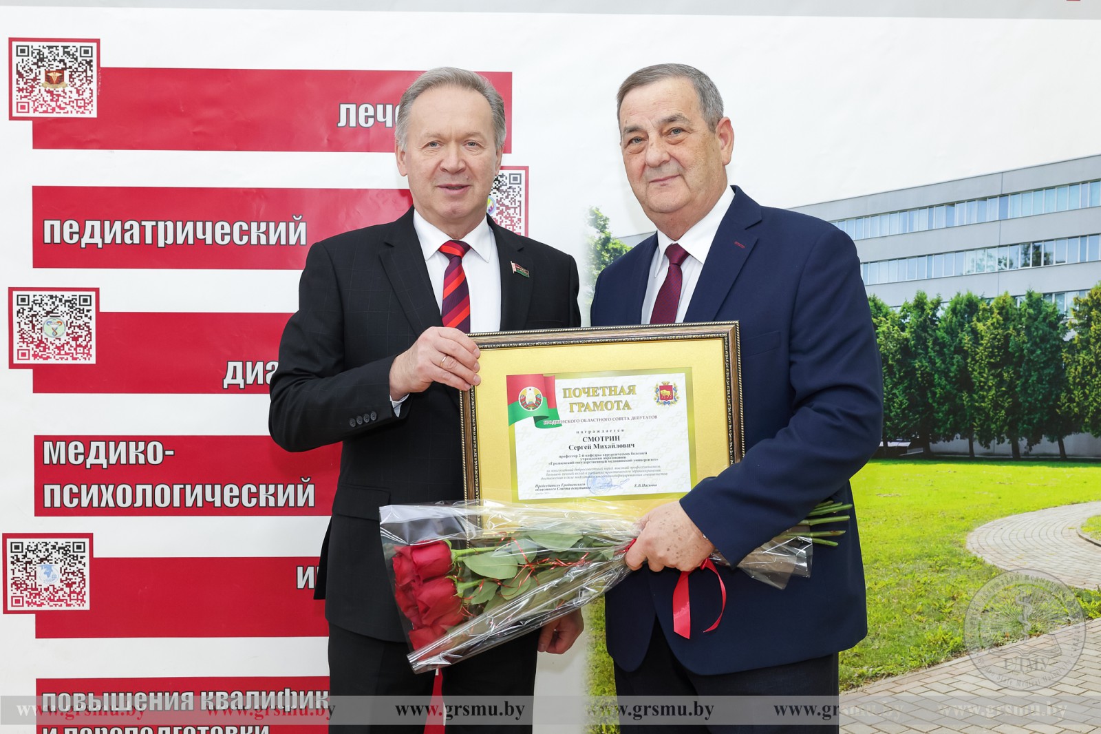Почетная грамота Гродненского областного Совета депутатов за многолетний добросовестный труд, высокий профессионализм, большой личный вклад в развитие практического здравоохранения и достижение в деле подготовки высококвалифицированных специалистов вручена профессору 2-й кафедры хирургических болезней Сергею Михайловичу Смотрину.