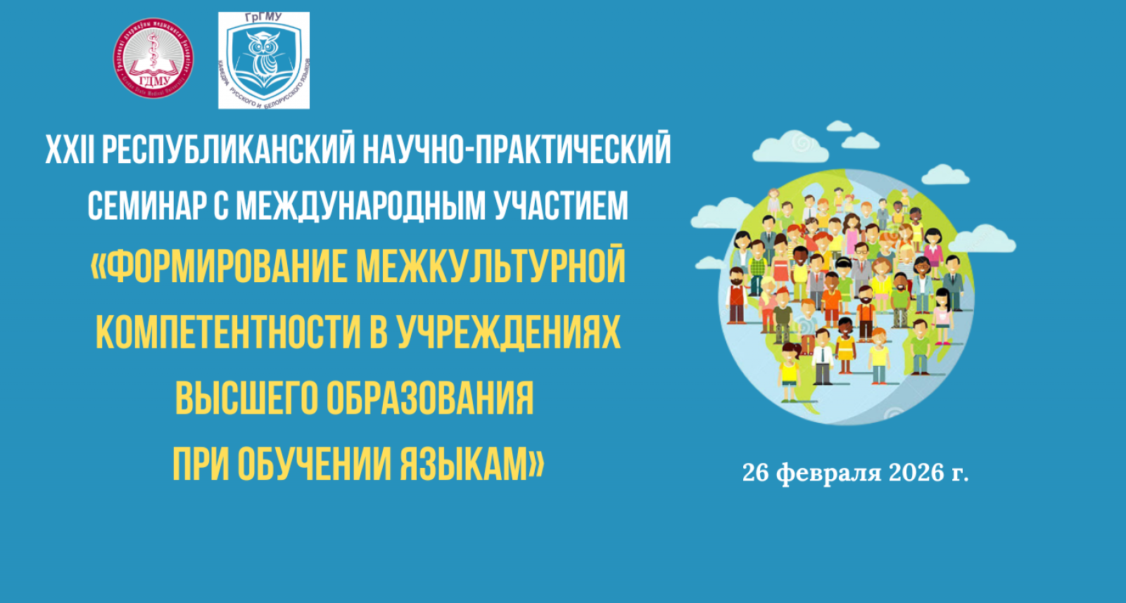 Уважаемые коллеги! Приглашаем вас принять участие в работе XXII Республиканского научно-практического семинара с международным участием «Формирование межкультурной компетентности в учреждениях высшего образования при обучении языкам, который состоится 26 февраля 2026 г.