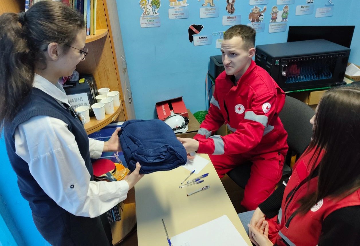 В рамках учений на базе местной школы был развернут пункт временного размещения, в котором располагались зоны для сна, приема пищи, медицинской и психологической помощи. Здесь ребята оказывали первую помощь и психо-социальную поддержку, выдавали одеяла и теплое питье «пострадавшим».
