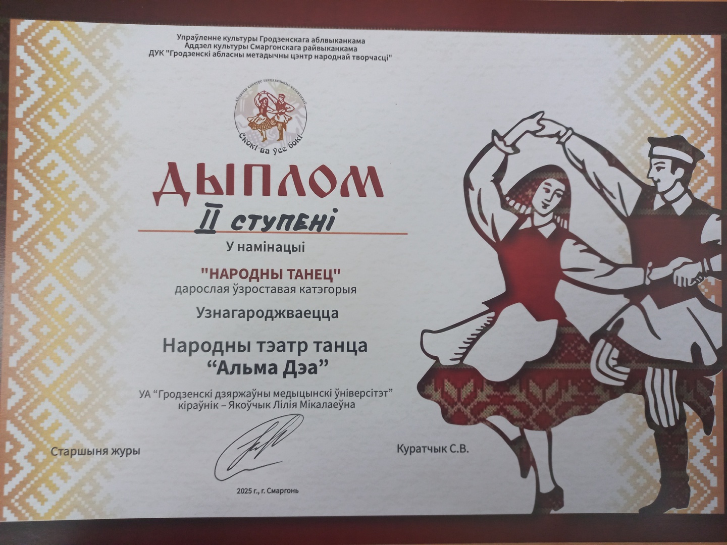 Народный театр танца «Alma Dea» стал лауреатом II степени областного конкурса танцевальных коллективов «Скокі ва ўсе бокі», заняв призовое место среди более чем 50 коллективов.