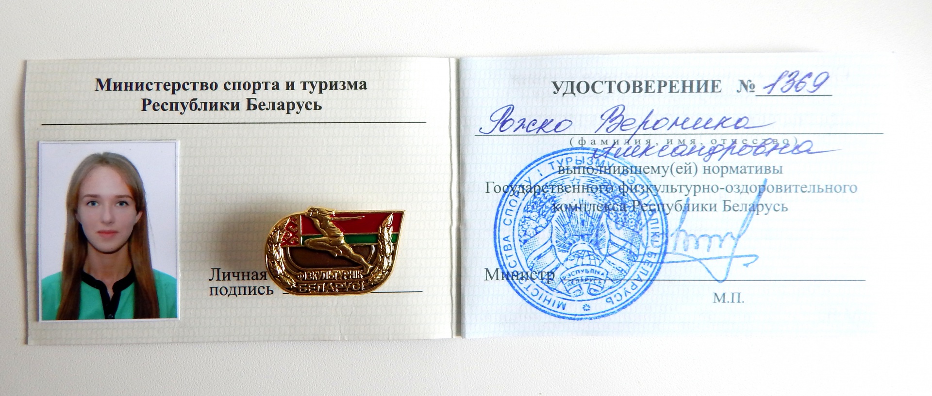 2020 год. Рожко Вероника Александровна, студентка 5 курса, 1 группы педиатрического факультета Гродненского государственного медицинского университета, награждена нагрудным значком «Физкультурник Беларуси» и удостоверением к нему.