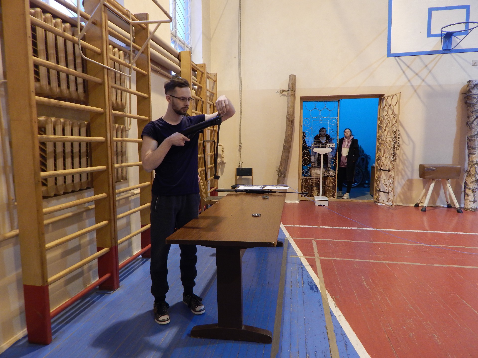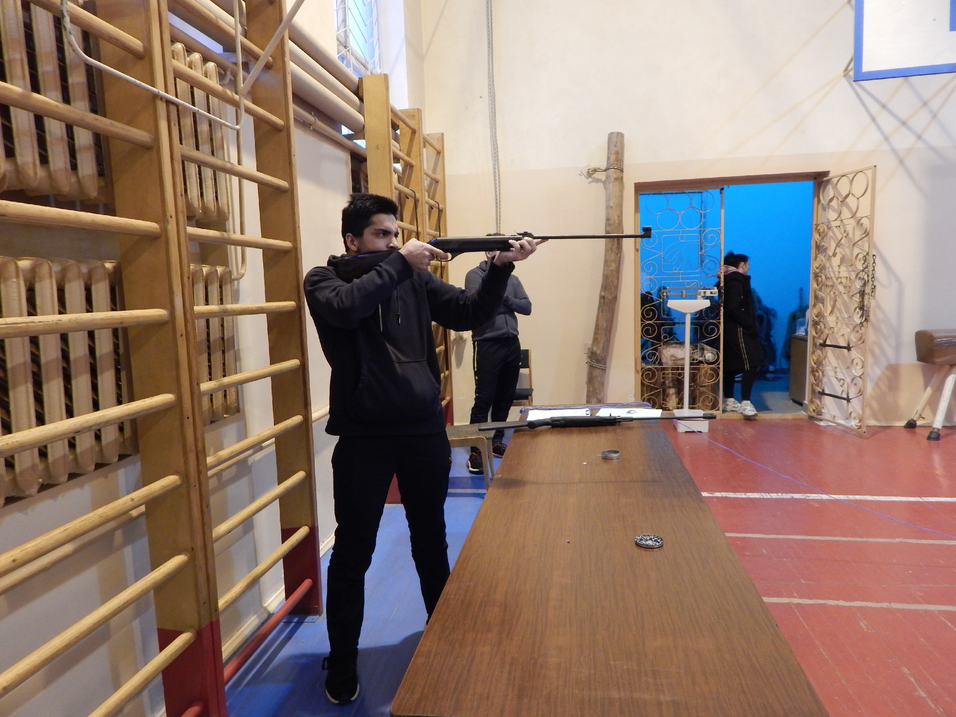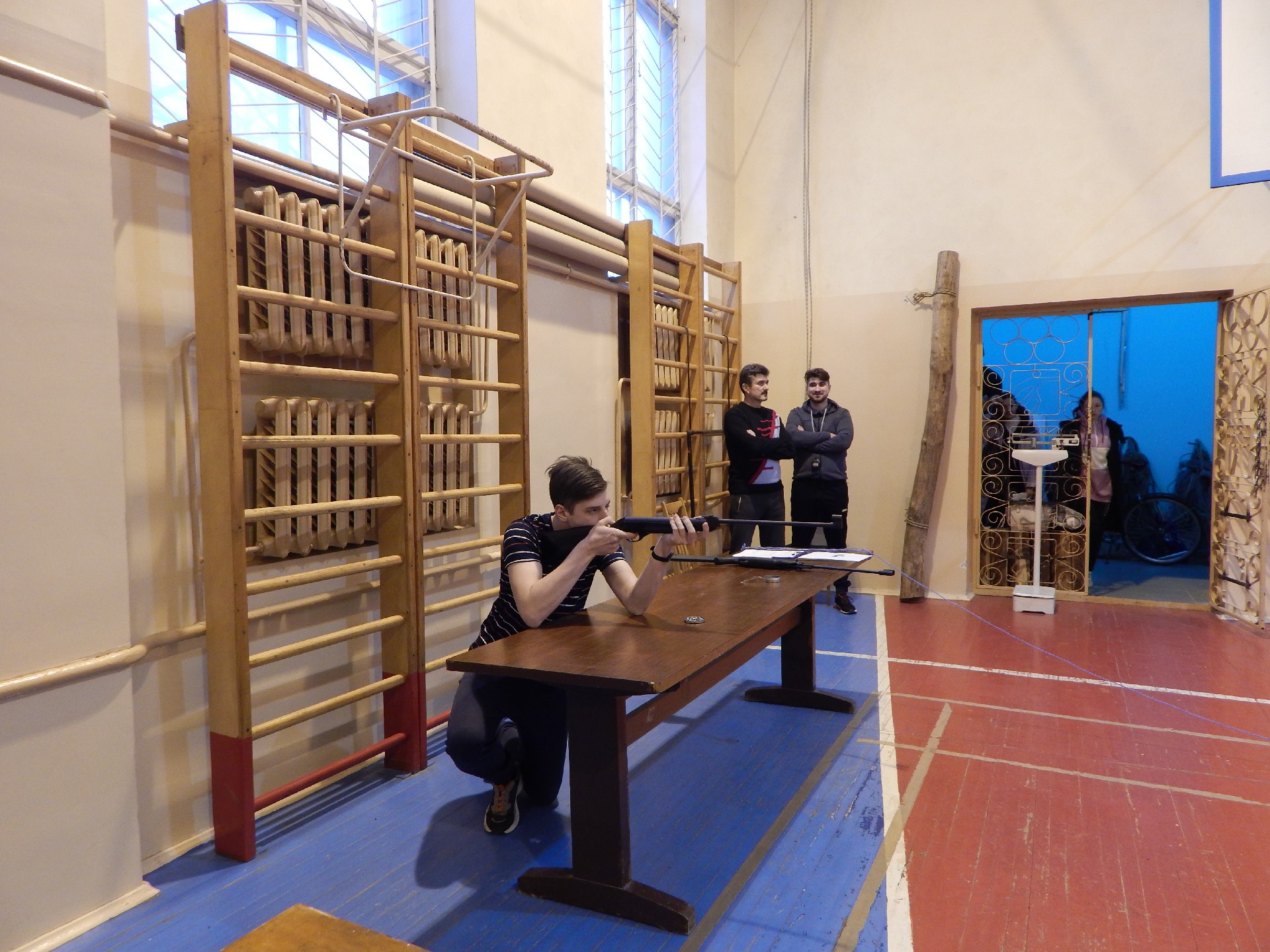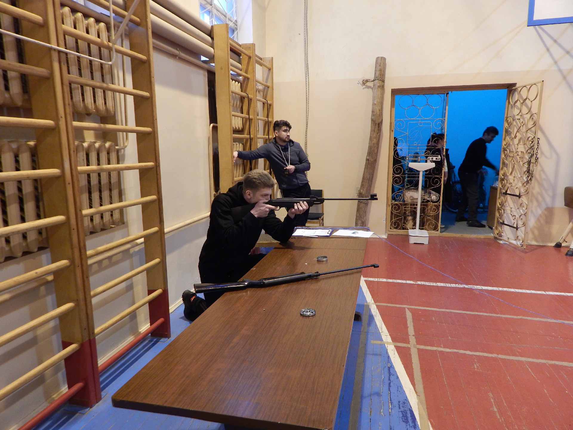Первый вид – стрельба из пневматической винтовки (5 участников в каждой команде). Условия – необходимо поразить 3 биатлонные мишени каждому из 3 пулек а кому и 30 было мало - на время. За сколько отстрелялись команда (разрыв по времени команда от команды), так и выходили на другой этап.