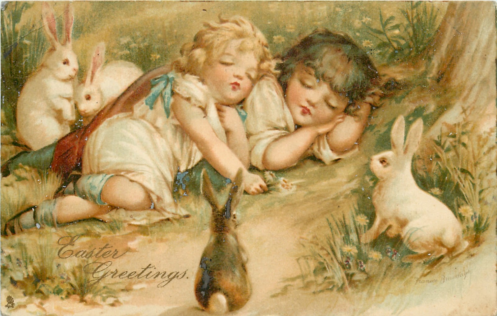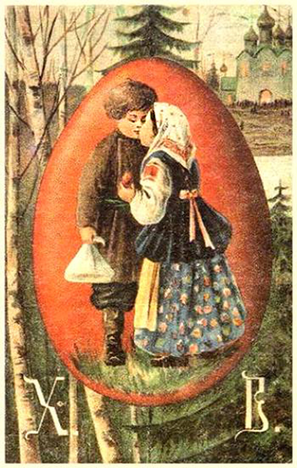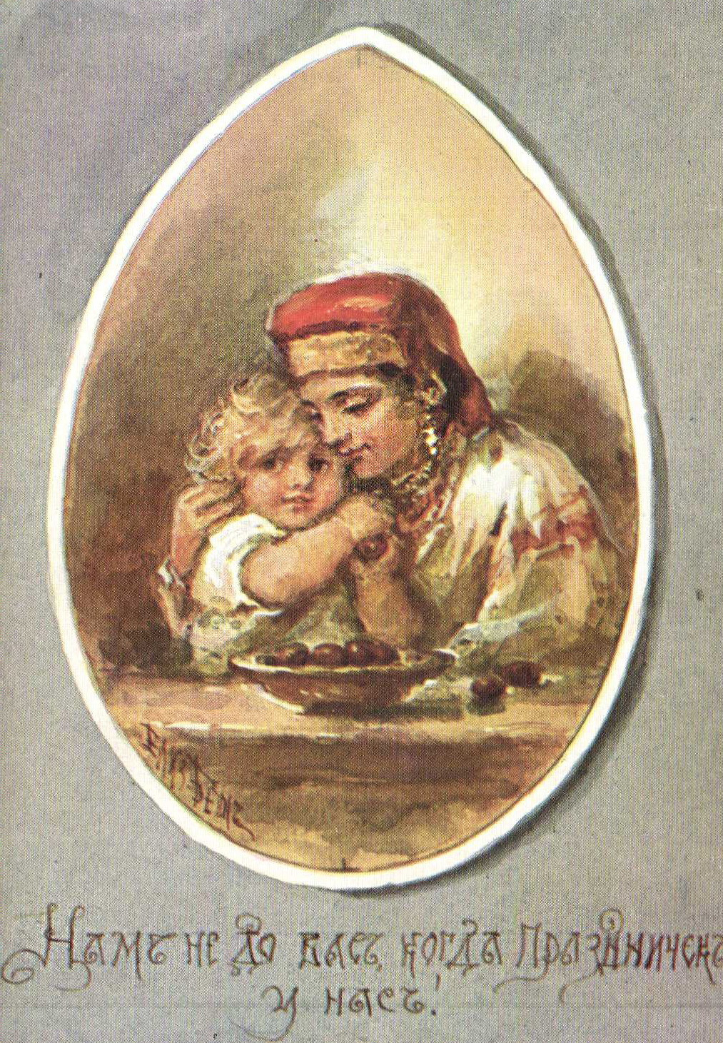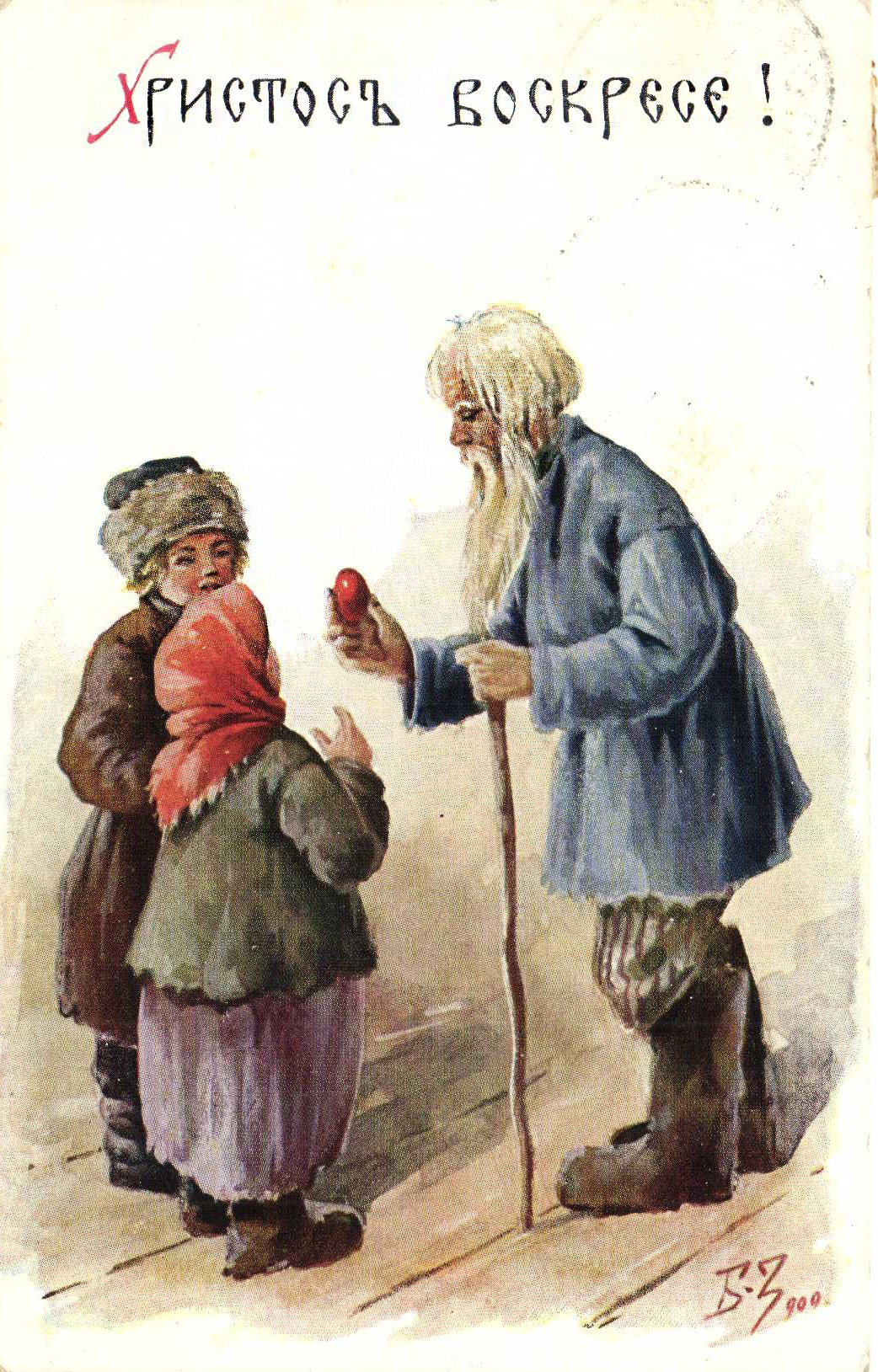 Очень редко в тематике Пасхальных поздравительных открыток использовались сюжеты со взрослыми.