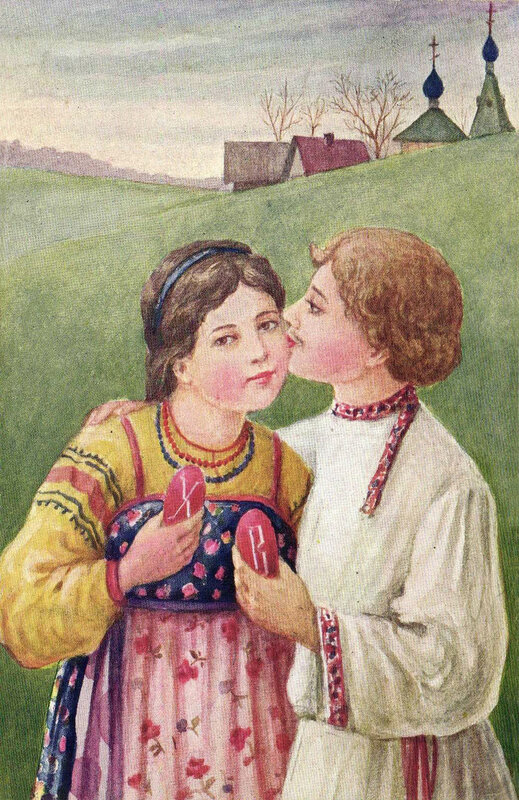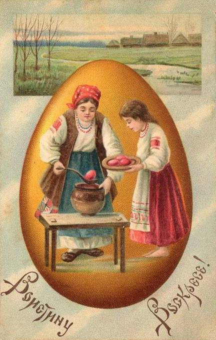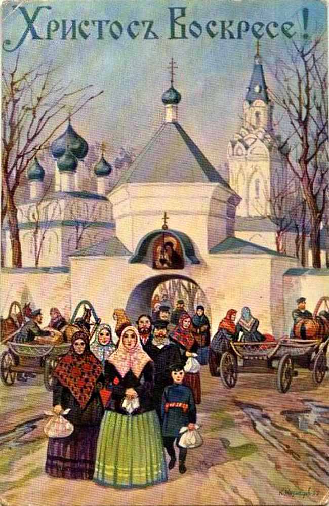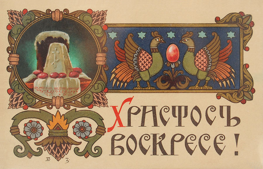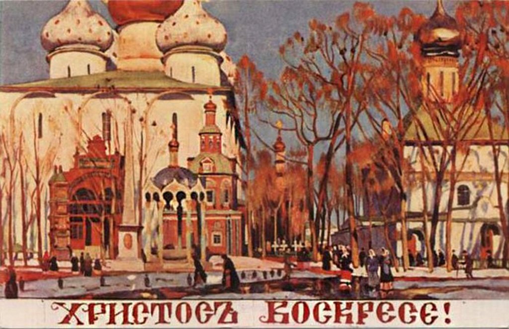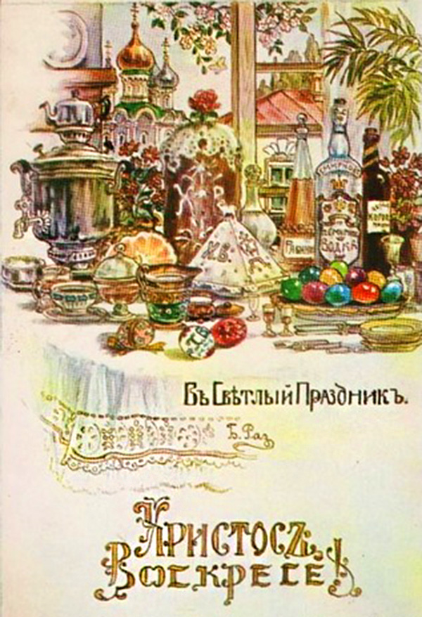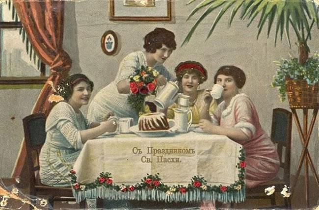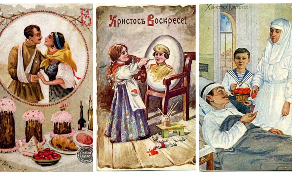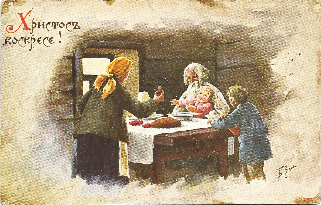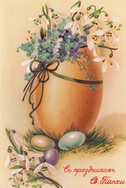 В послереволюционные годы пасхальные традиции пытались сохранить эмигранты. Правда, в 1920-е годы из печатавшихся эмигрантских открыток с художественными репродукциями поздравительных было мало. Причем слов «Христос Воскресе!» на них не было. Без этой надписи в Югославии и в Дании вышли и открытки с репродукцией картины великой княгини Ольги Александровны «Пасхальный стол».