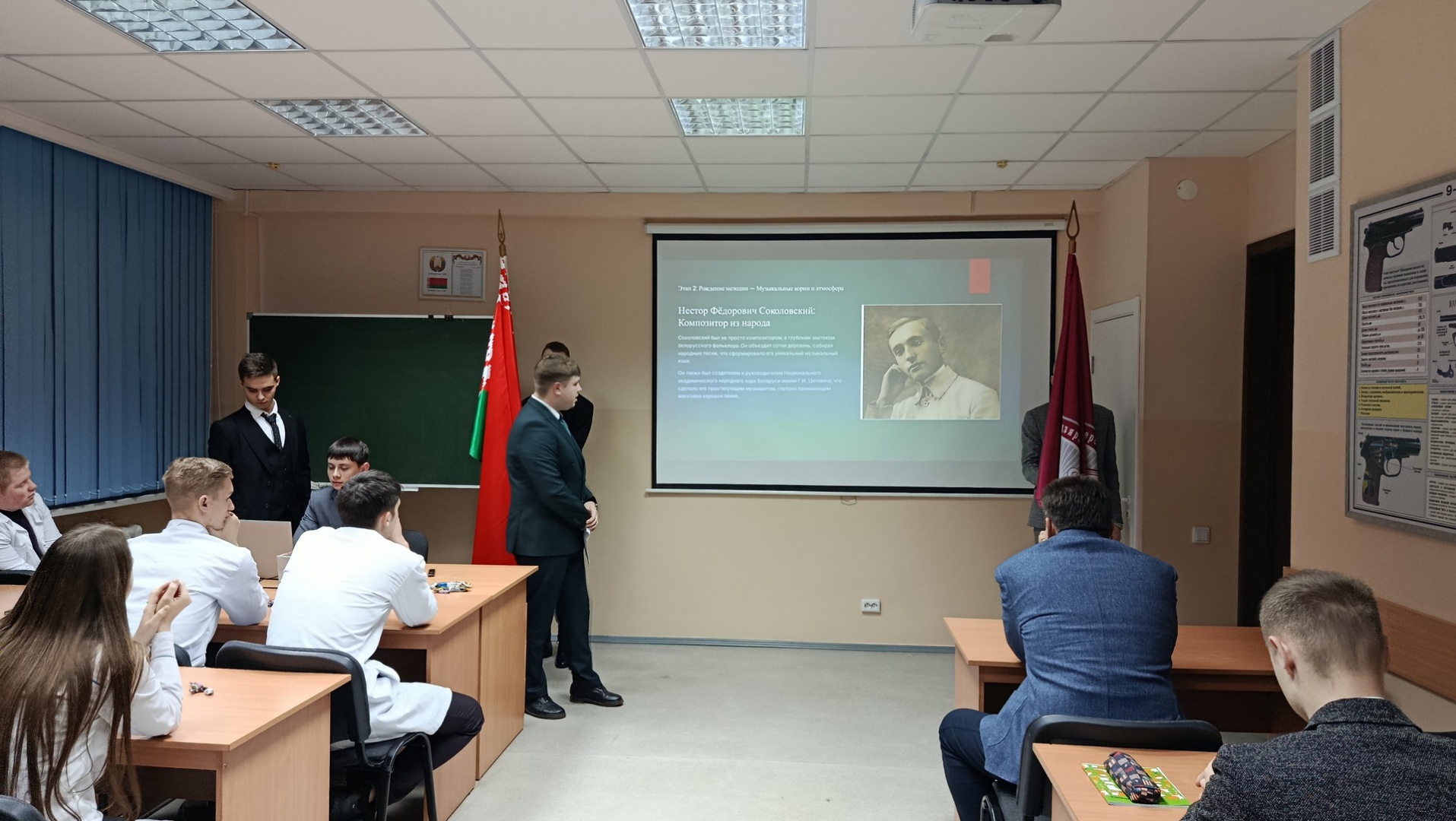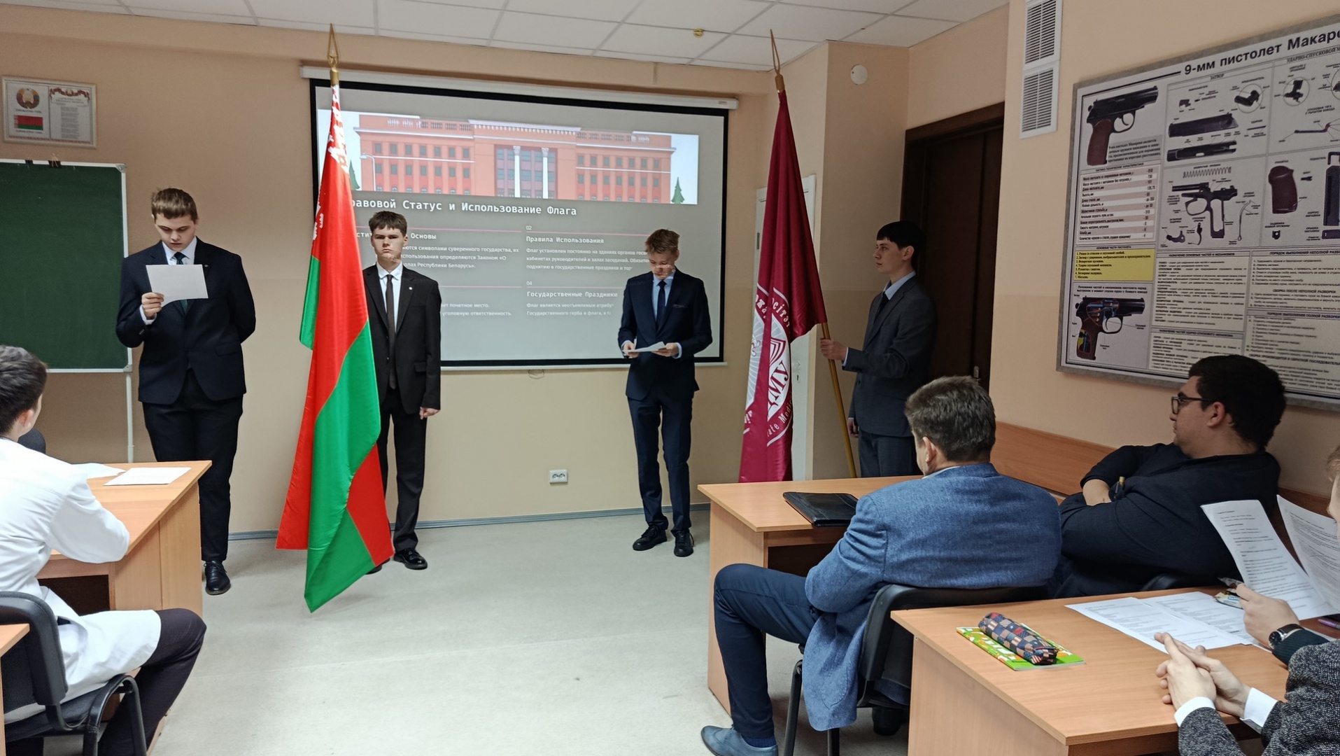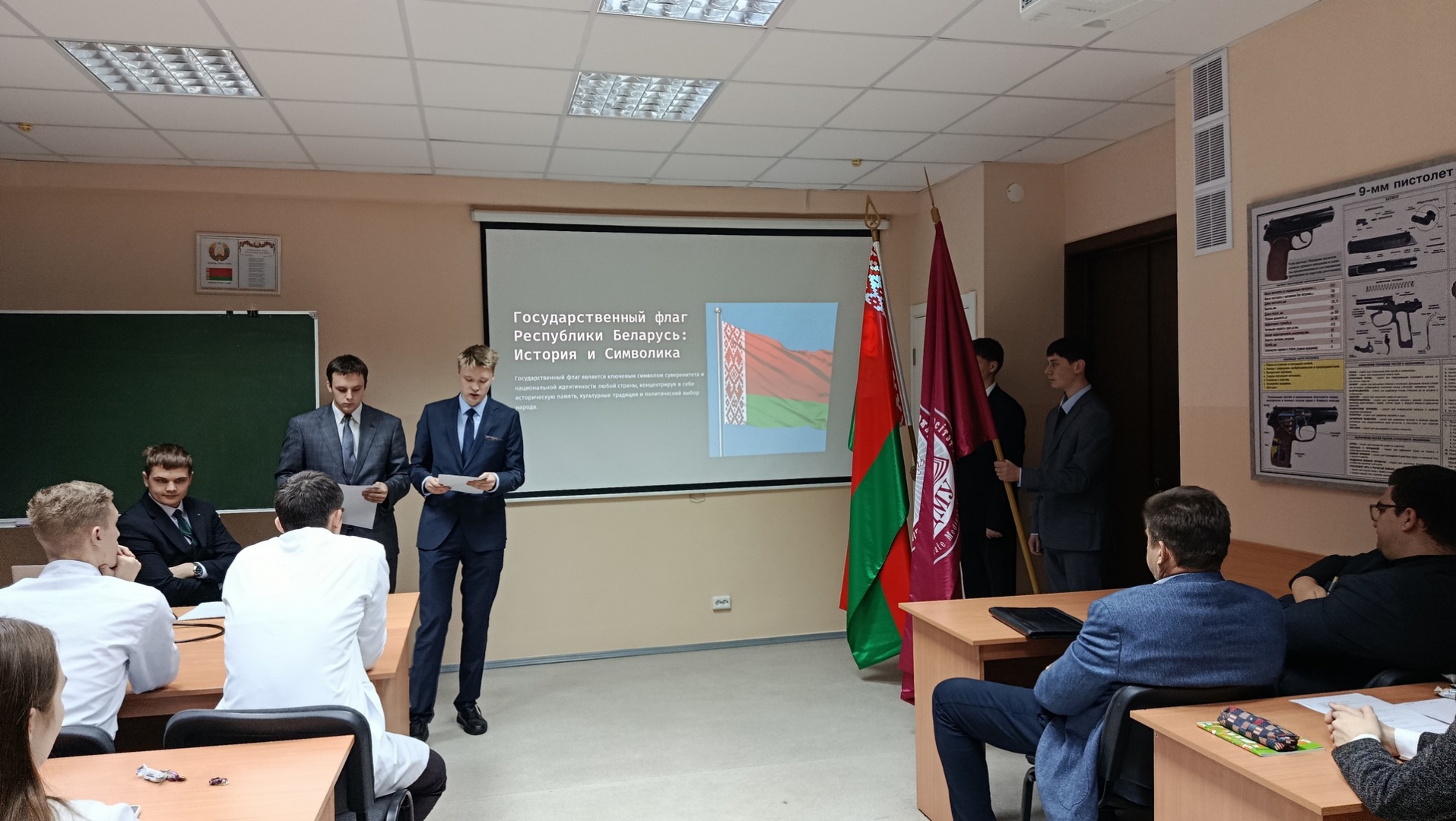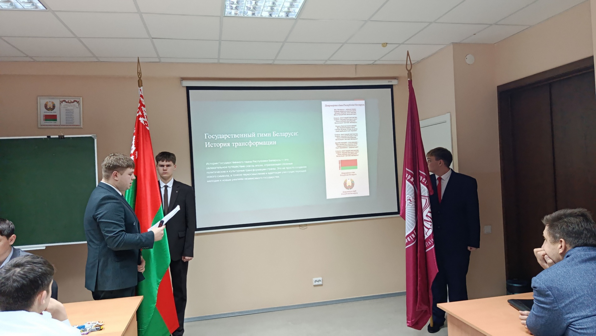 Студенты Трофимук Владимир, Хвоенок Никита, Левончук Станислав, Синявский Александр, Ермакович Антоний, Улицкий Владислав представили информацию о гербе, флаге и гимне Республики Беларусь.