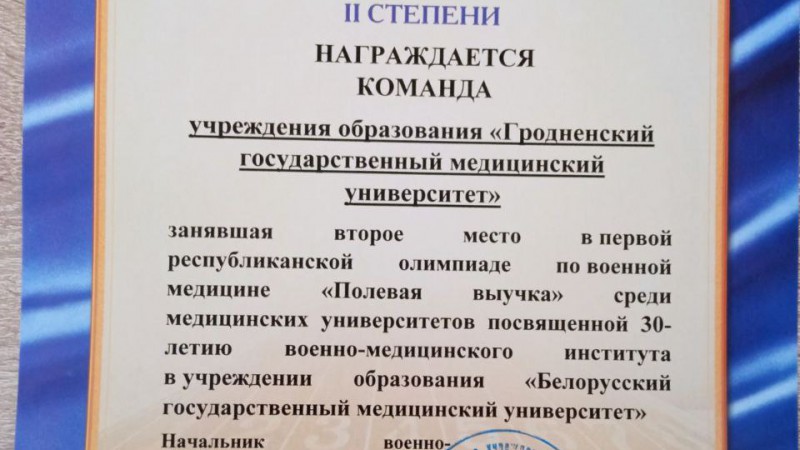 По итогам всех конкурсных испытаний Команда ГрГМУ заняла II место! Студент Бронислав Малишевский в индивидуальном первенстве занял почетное III место. Подполковнику медицинской службы Павлу Леонтьевичу Корнейко за подготовку команды объявлена благодарность.