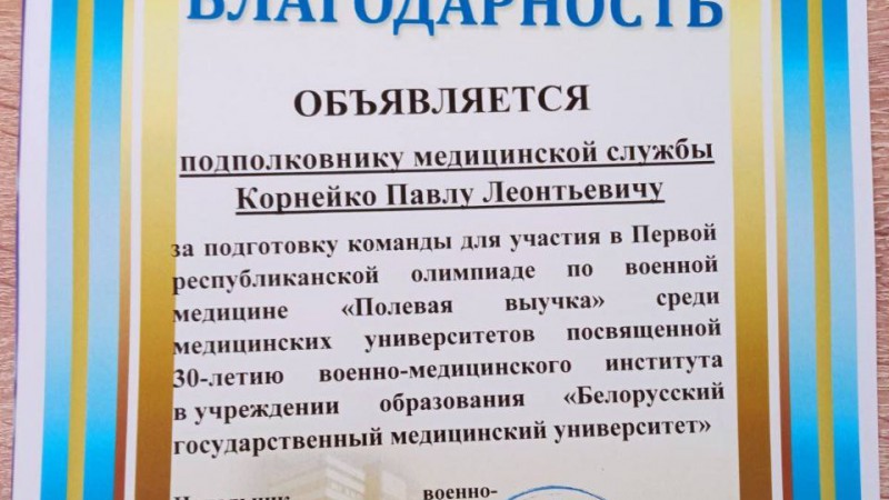 Нашу команду представляли: студенты 4 курса лечебного факультета Максим Будкевич, Павел Герусь, Кула Хасан Беркант Берколович, Бронислав Малишевский, Даниил Петрашкевич, Глеб Труханов и студент 4 курса педиатрического факультета Андрей Ганебный. Руководитель команды – подполковник медицинской службы, преподаватель военной кафедры Павел Леонтьевич Корнейко.
